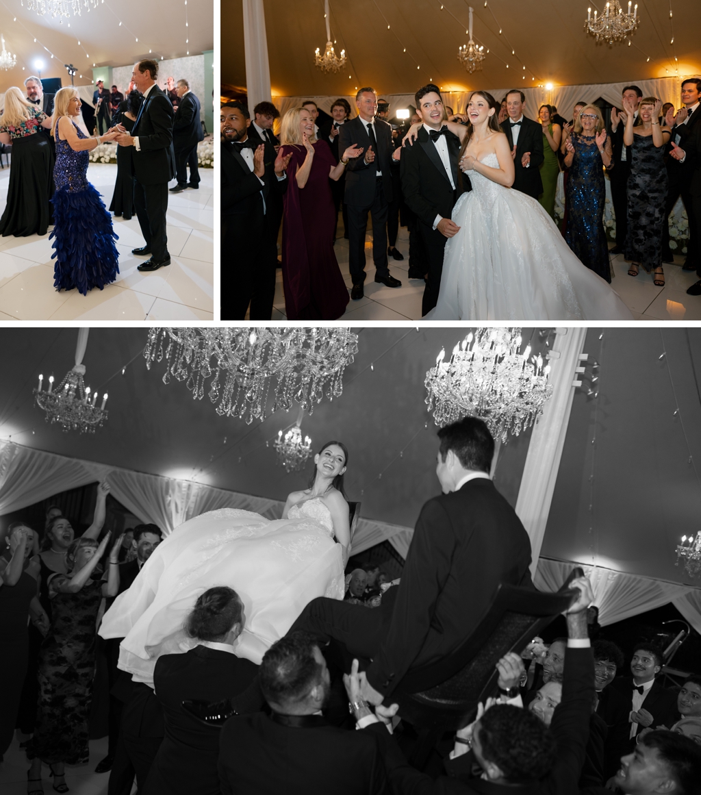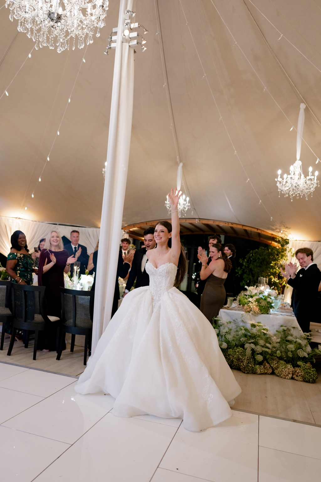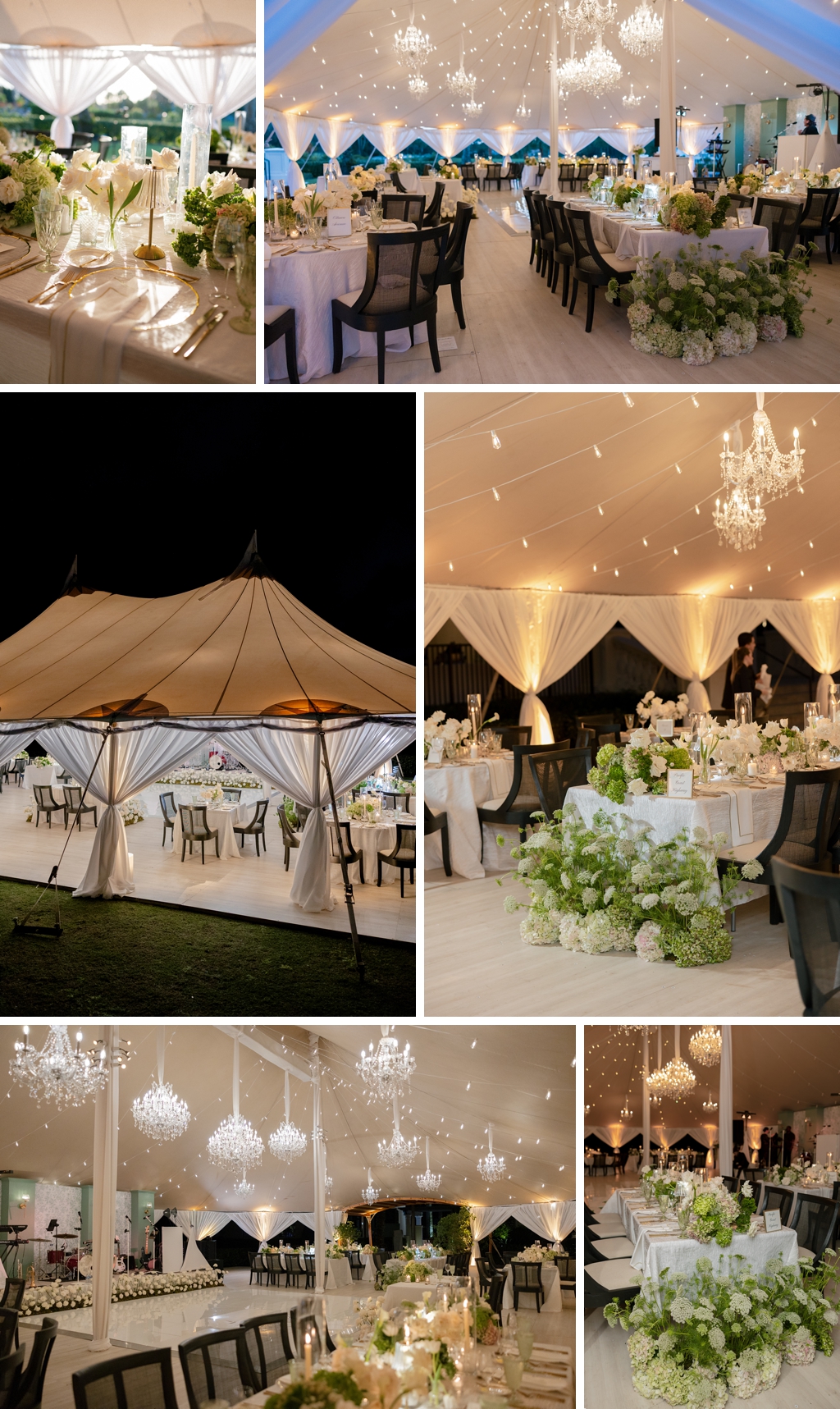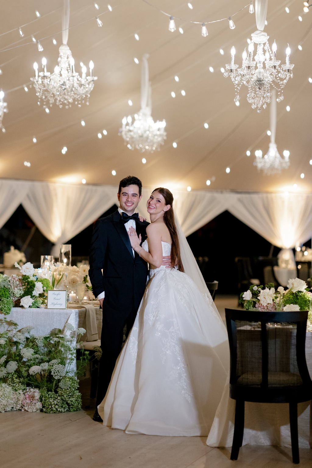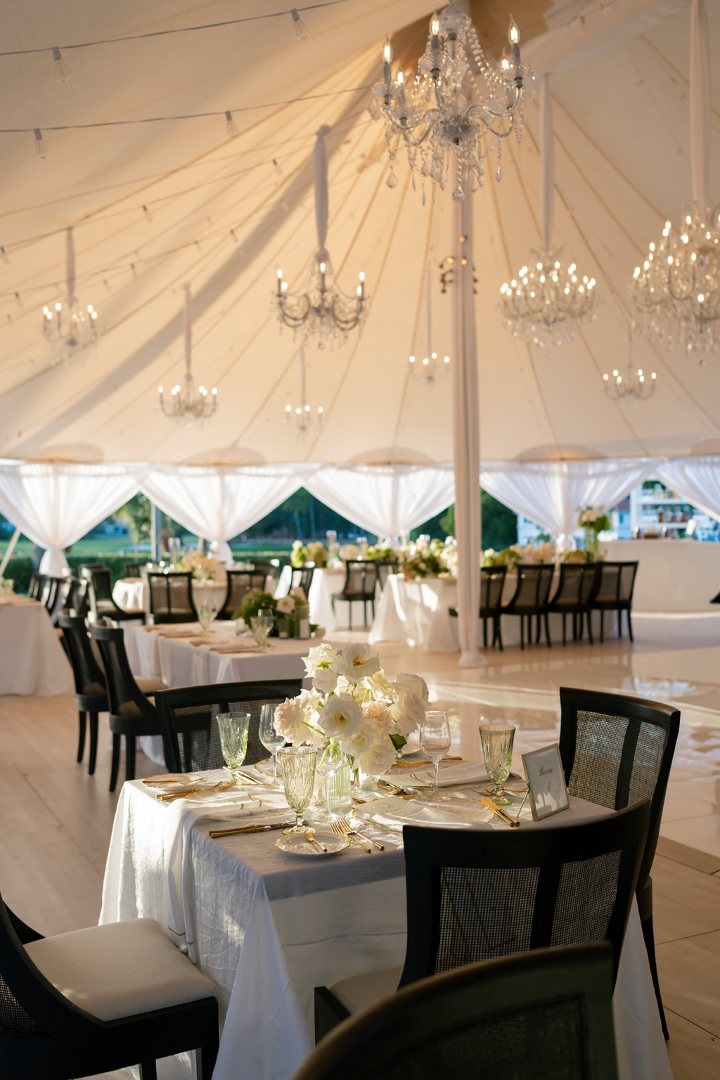 The Sperry tent was draped in white fabric, giving it a sophisticated yet inviting feel. Black rental chairs from Atlas Event Rental provided comfort and a modern touch to the décor. To add a bit of sparkle, they hung dazzling chandeliers that illuminated the space beautifully.