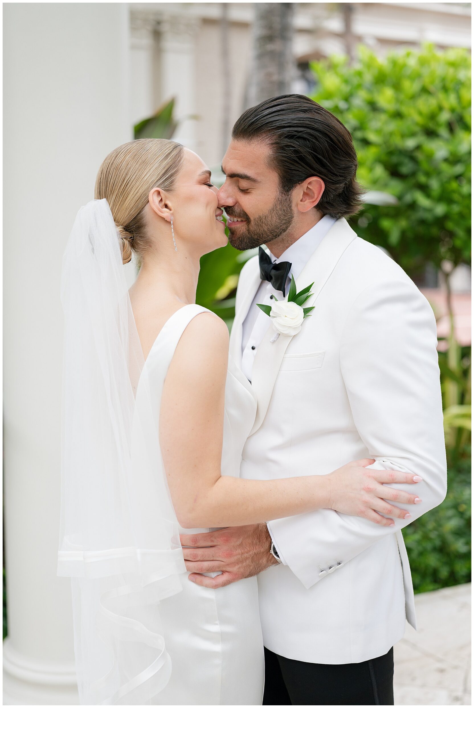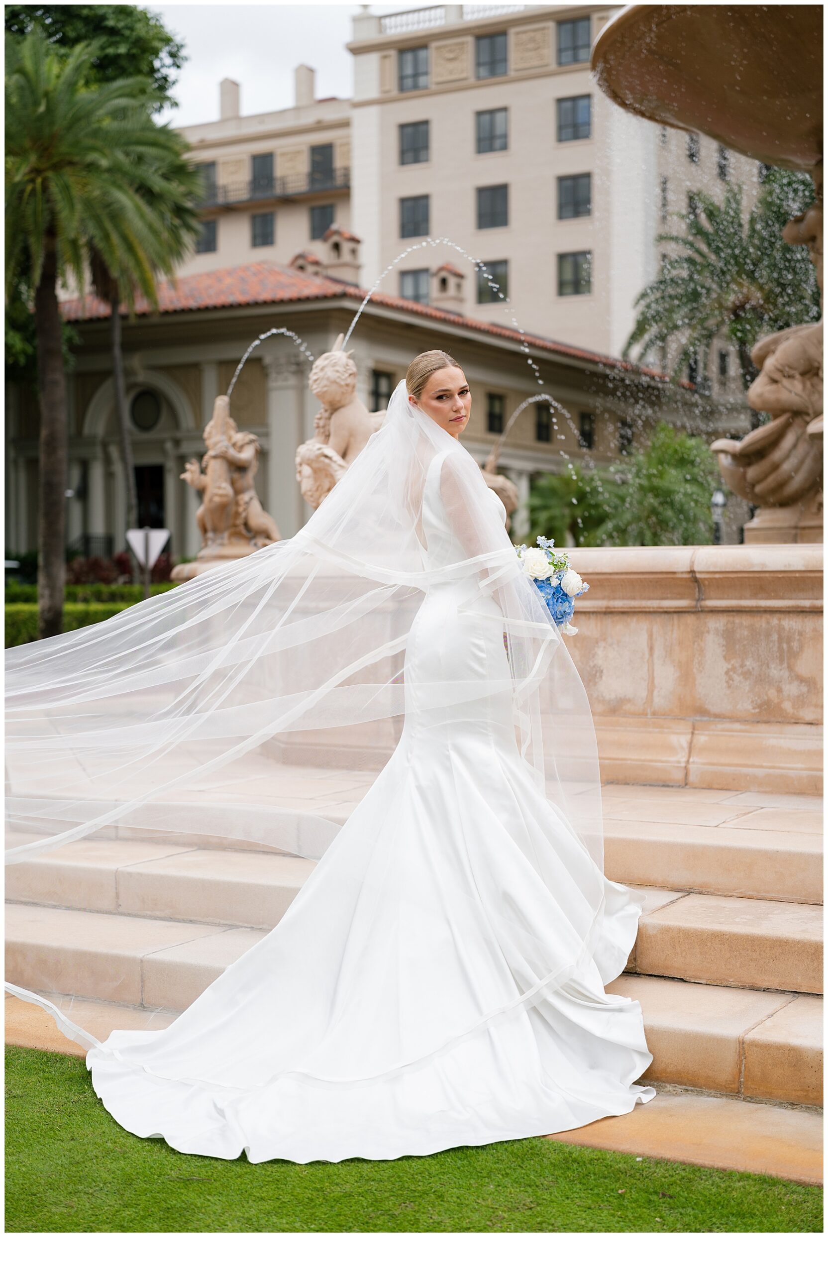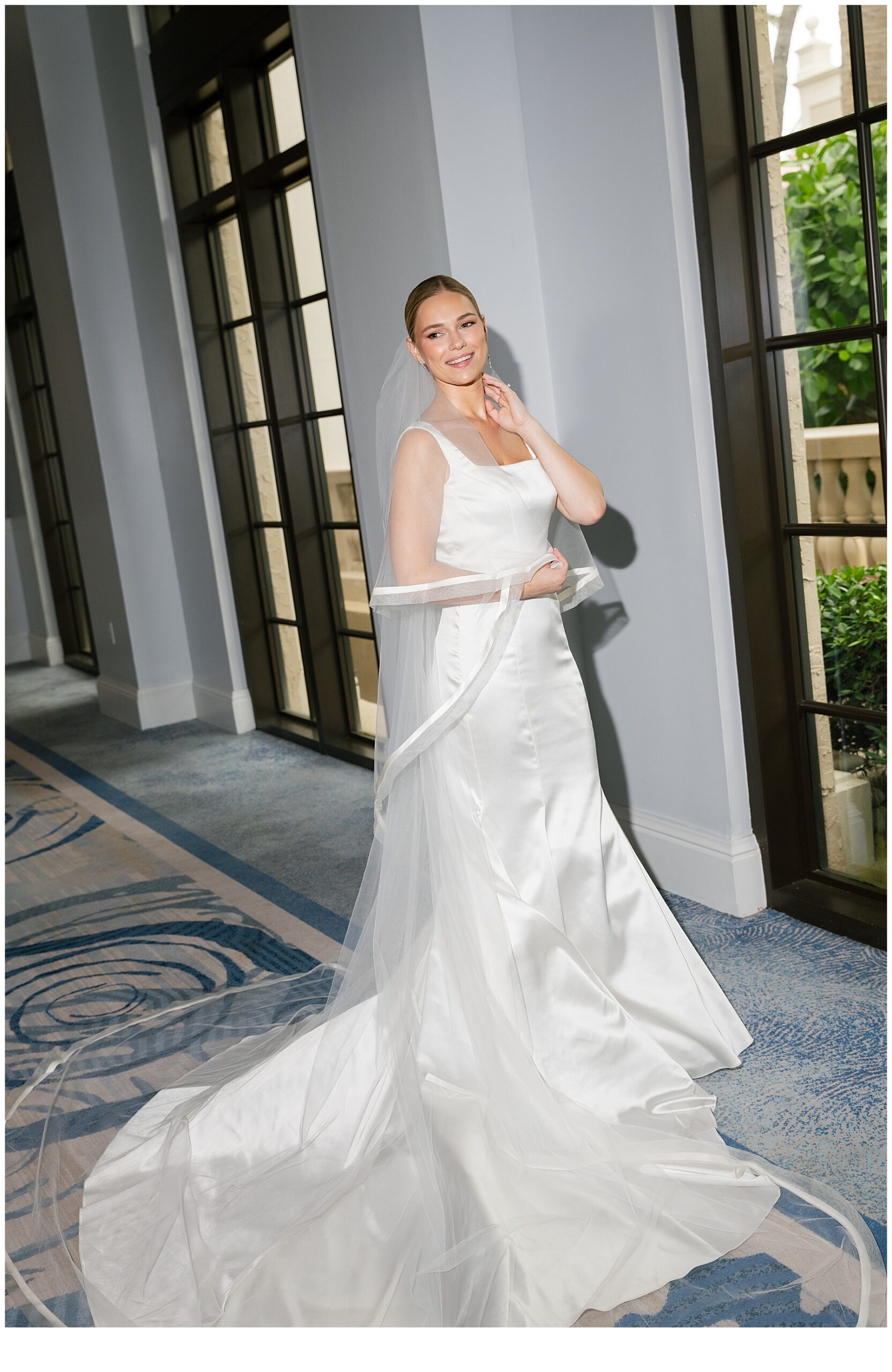 Bathed in soft natural light at the beautiful Breakers in Palm Beach, the bride’s look was the definition of timeless elegance. She wore a sleek satin gown that flowed effortlessly into a dramatic train. A sheer veil added a romantic softness, catching the light as it draped delicately around her shoulders. Her hair was styled in a polished low bun, allowing her natural beauty to shine with understated makeup and a glowing complexion. Every detail felt intentional, modern, and refined.