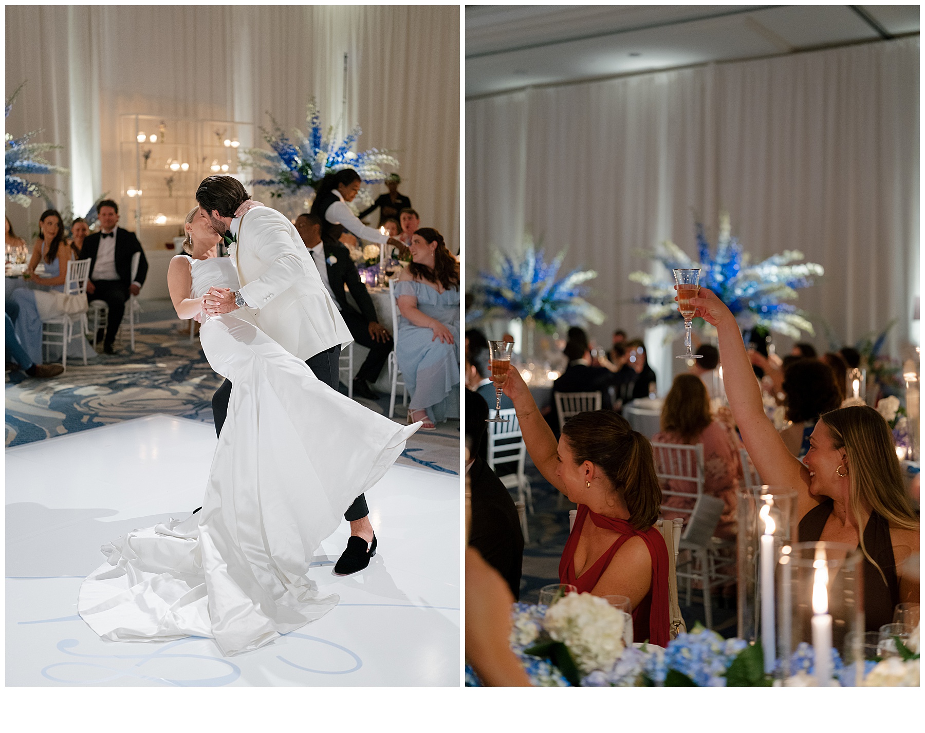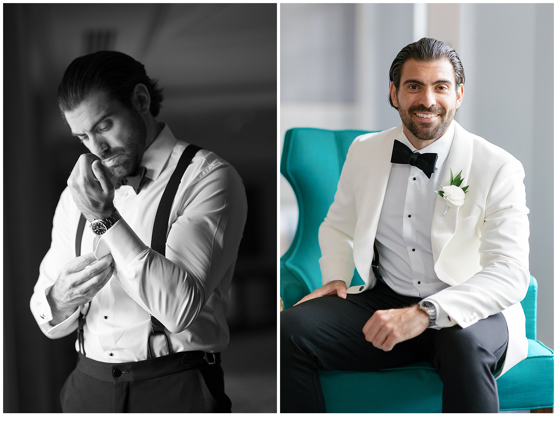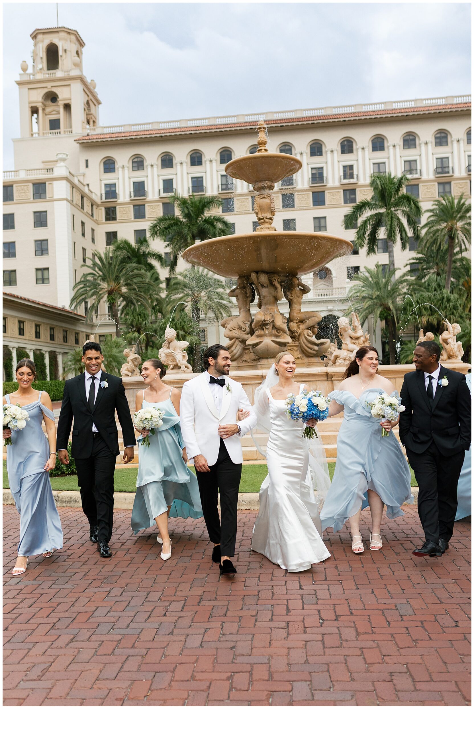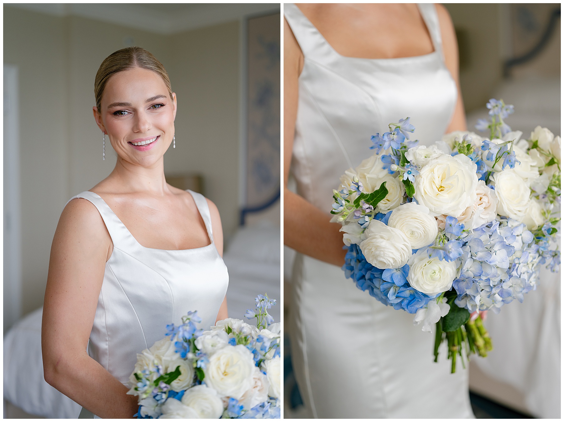 Bathed in soft natural light at the beautiful Breakers in Palm Beach, the bride’s look was the definition of timeless elegance. She wore a sleek satin gown that flowed effortlessly into a dramatic train. A sheer veil added a romantic softness, catching the light as it draped delicately around her shoulders. Her hair was styled in a polished low bun, allowing her natural beauty to shine with understated makeup and a glowing complexion. Every detail felt intentional, modern, and refined.