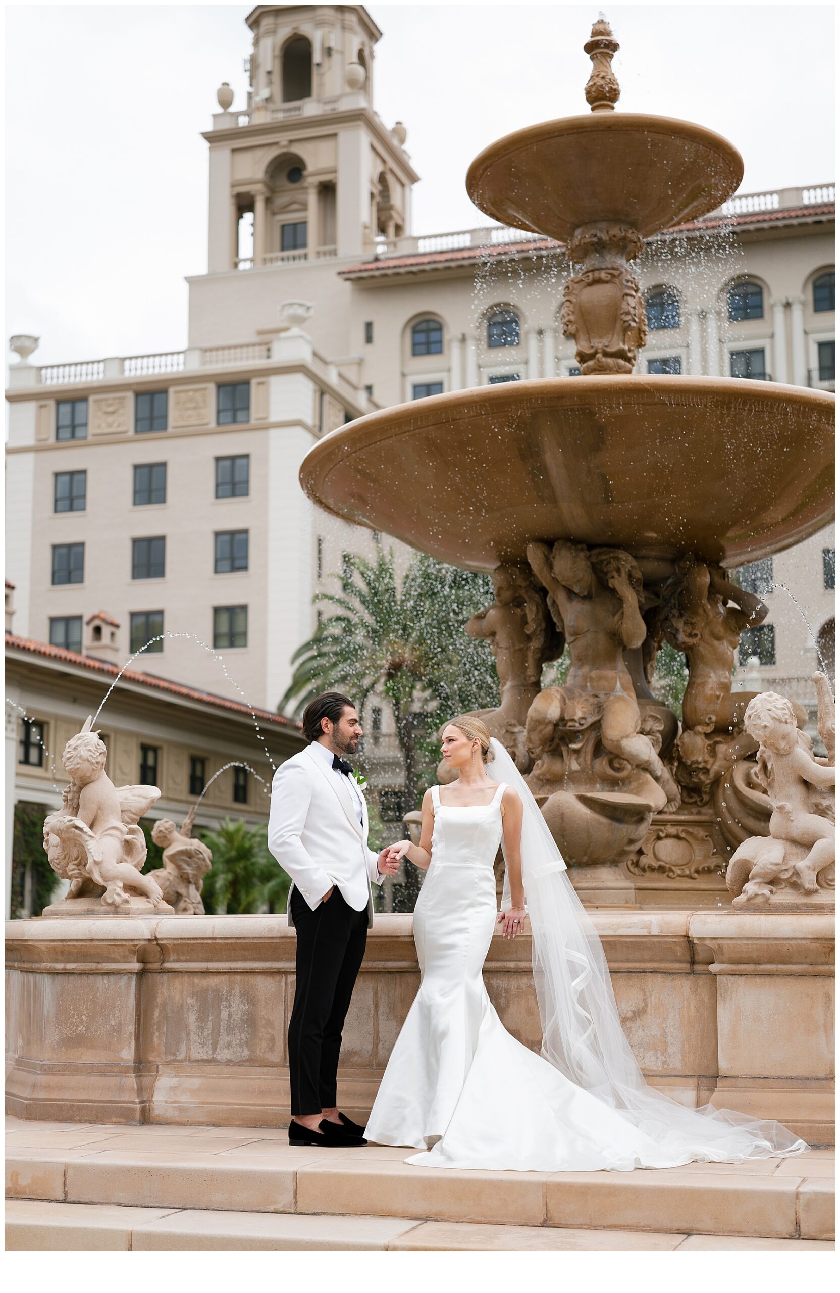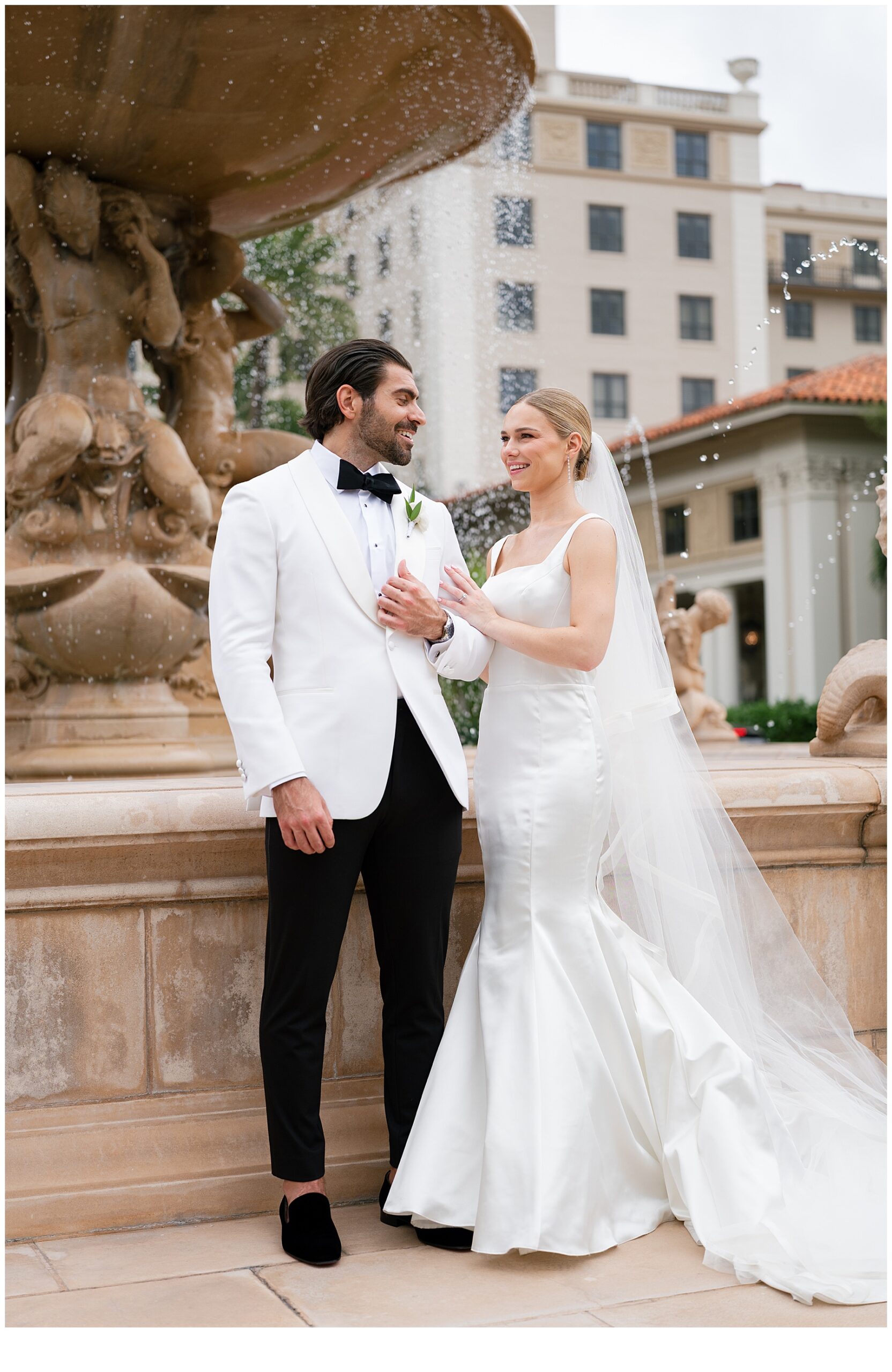 Following the ceremony, the newlyweds shared quiet moments together near an elegant stone fountain. Their relaxed smiles and natural connection were evident as water cascaded behind them, adding movement and romance to the scene. The surrounding architecture and timeless landscape created a luxurious backdrop, making every portrait feel cinematic and heartfelt.