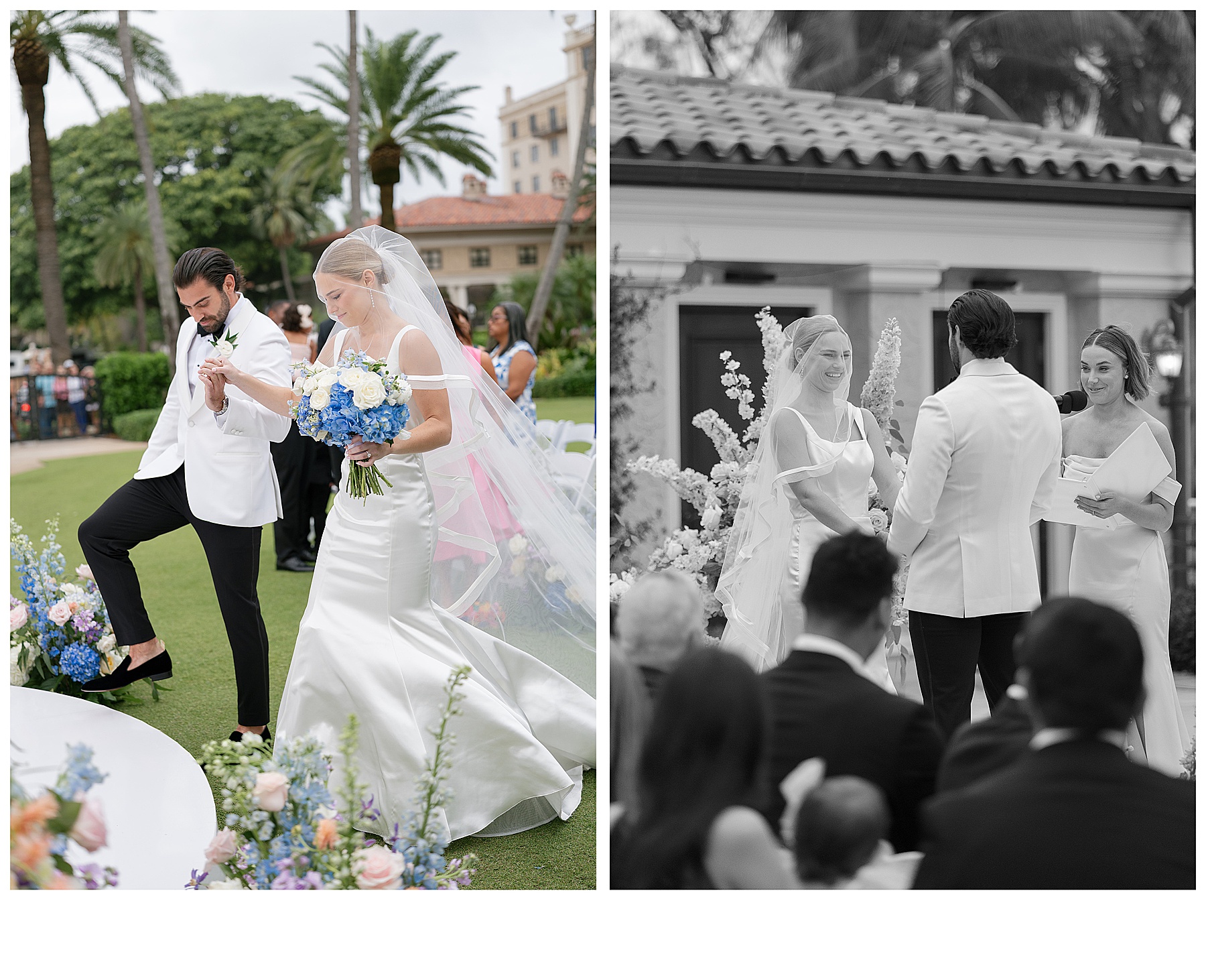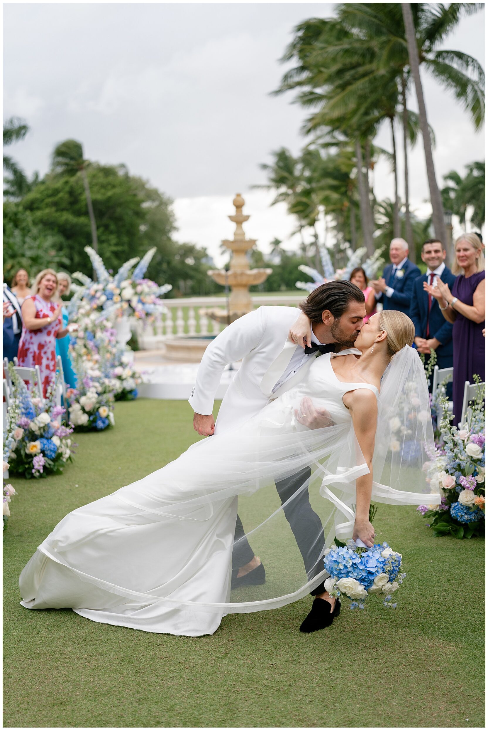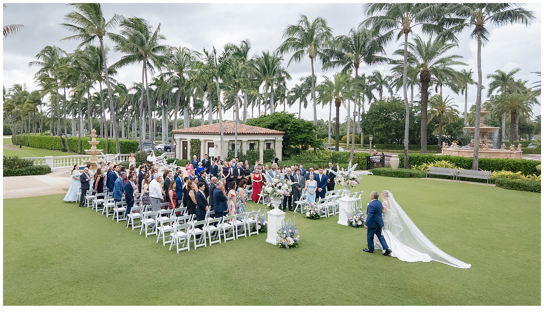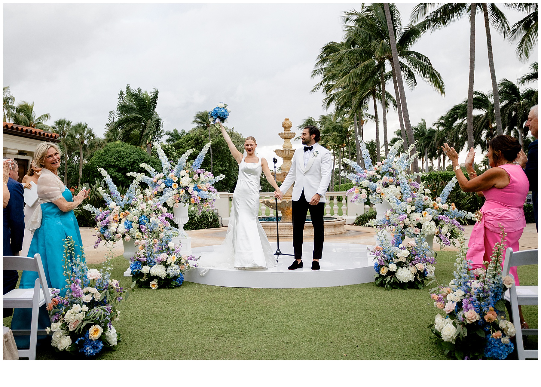 The ceremony took place outdoors on a lush green lawn framed by towering palm trees, creating a serene and elevated setting. Guests were seated along a central aisle overflowing with pastel florals in shades of soft blue, lavender, blush, and ivory. Large floral arrangements anchored the aisle, adding both scale and intimacy to the space. Under a cloudy sky that diffused the light perfectly, the couple exchanged vows in a setting that felt both grand and deeply personal.