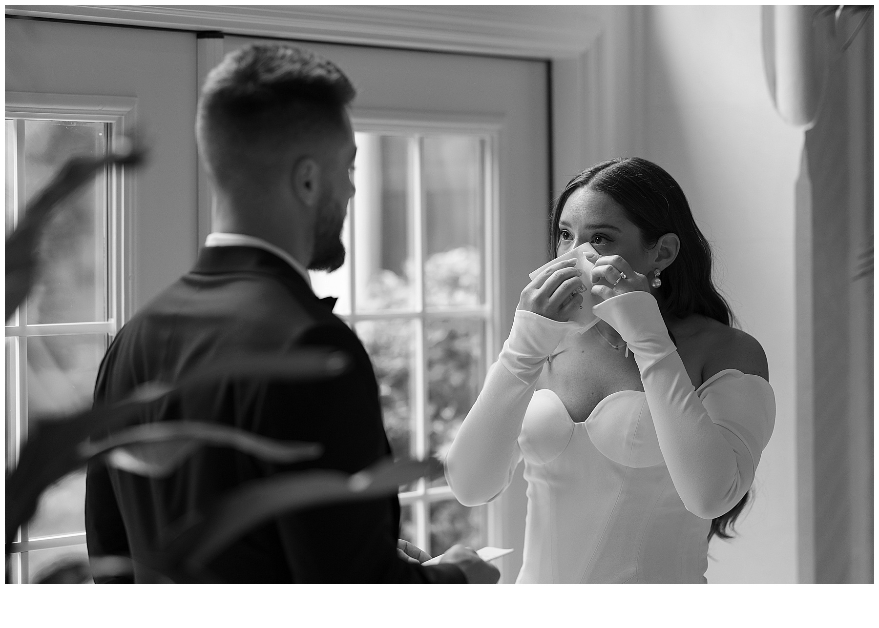The bride stunned in a sleek off the shoulder gown that felt polished and contemporary. Paired with a dramatic cathedral length veil her look was refined yet understated allowing the design and details to speak for themselves. Soft white florals and a neutral palette allowed the natural beauty of the surroundings and the couple’s connection to take center stage.