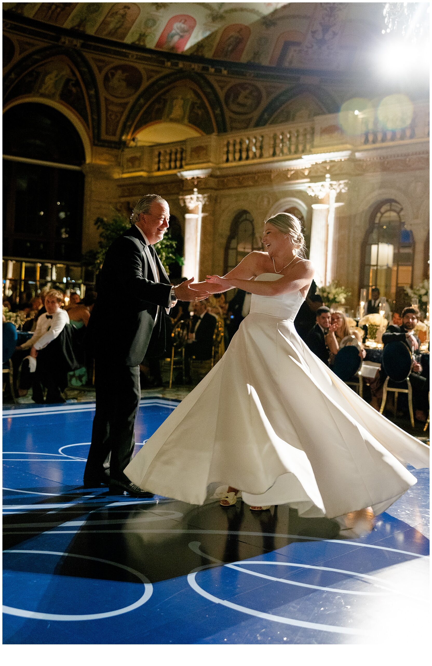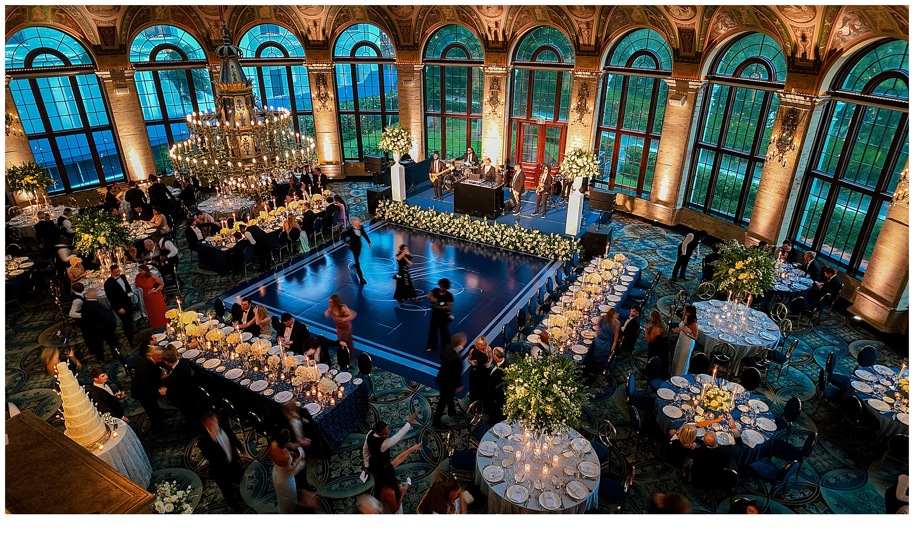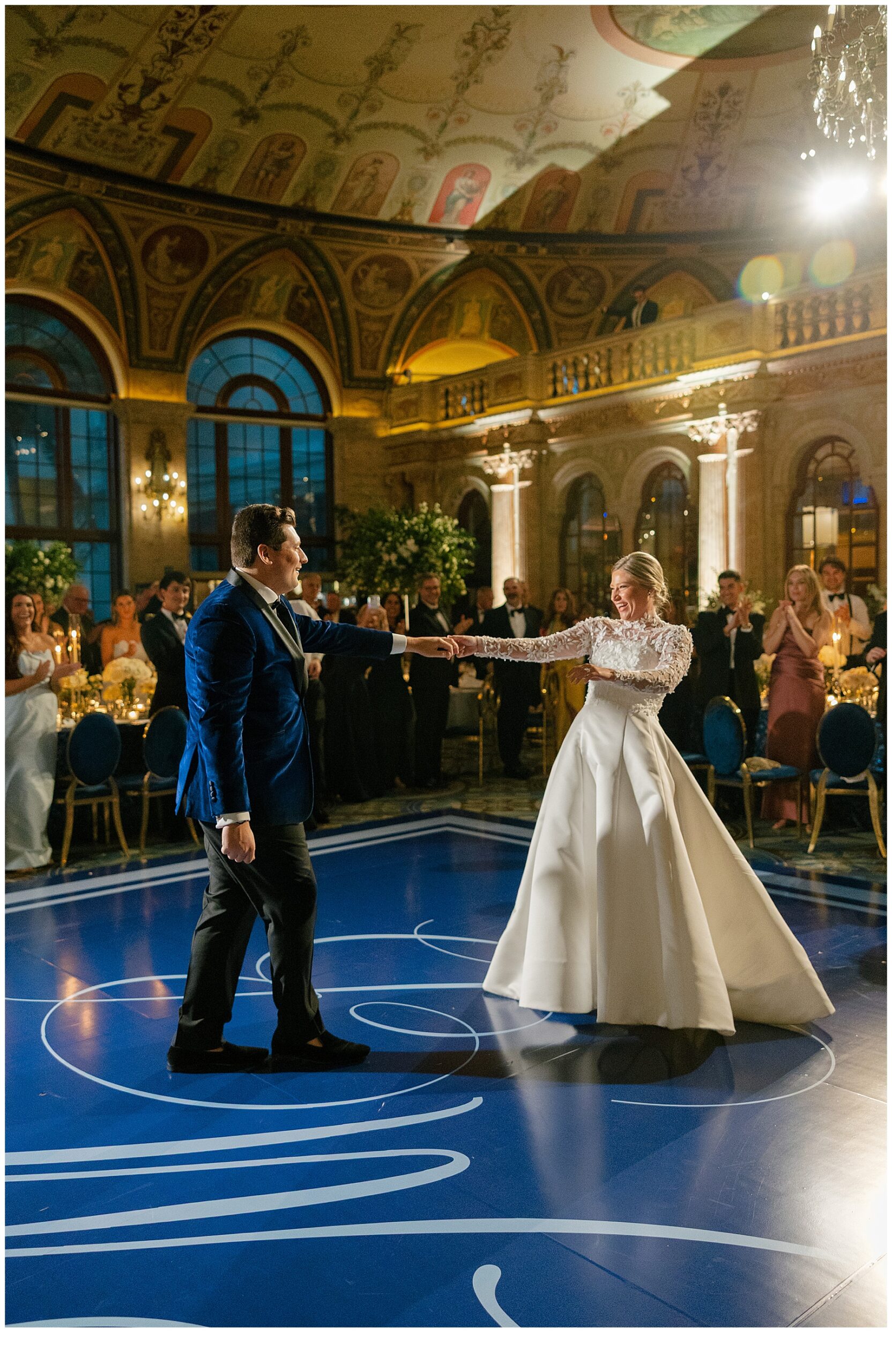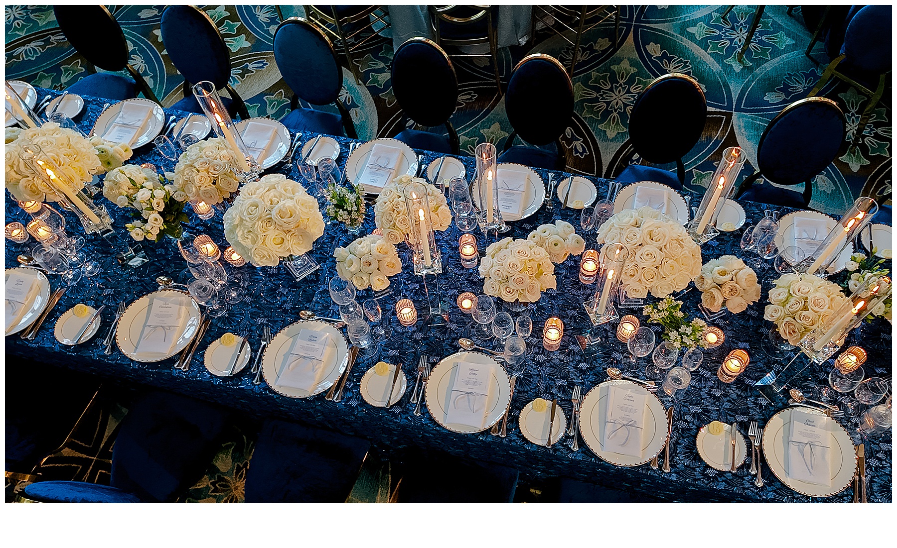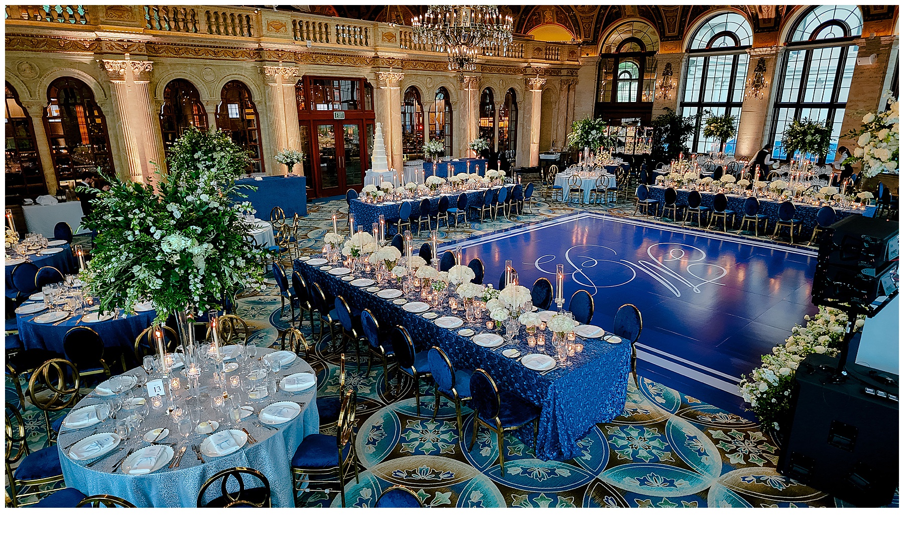 For the reception, The Breakers ballroom was transformed into a refined celebration of luxury. Long tables dressed in rich navy linens, gold accented chairs, and abundant white floral arrangements created a striking contrast against the venue’s historic architecture. A custom blue dance floor with elegant monogramming anchored the room, inviting guests to gather, celebrate, and dance late into the evening.