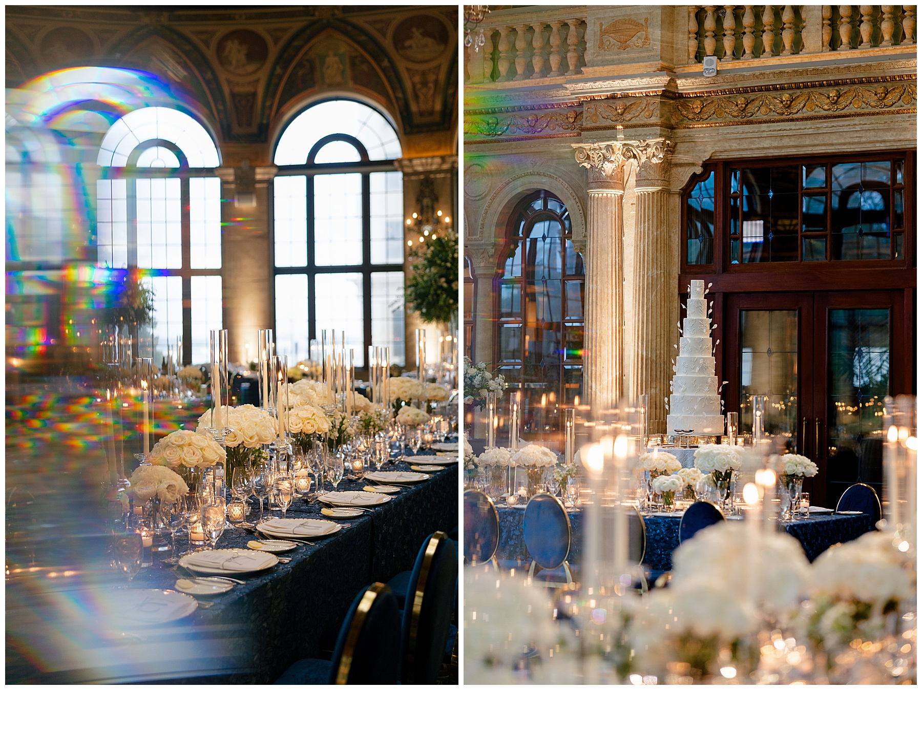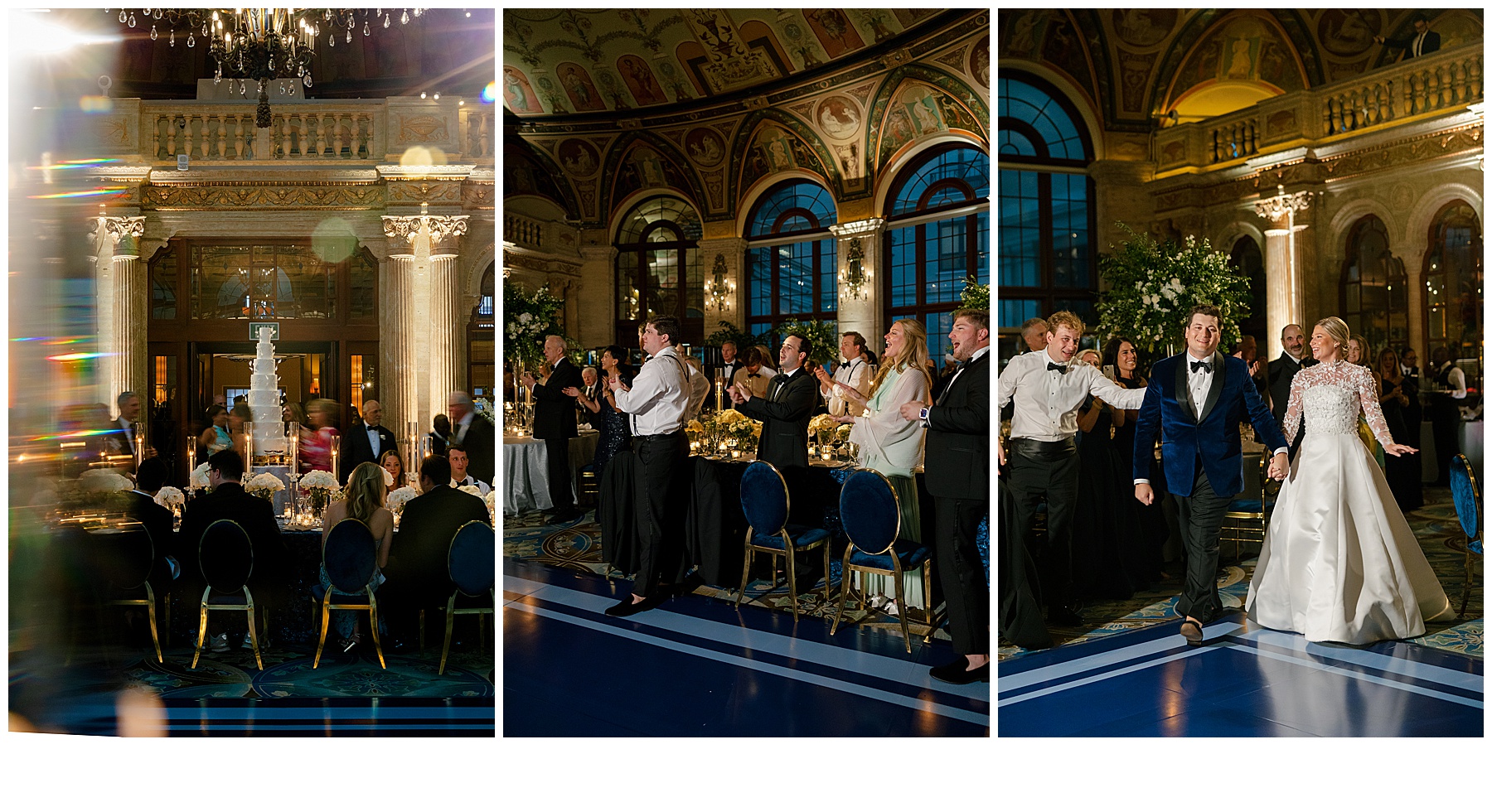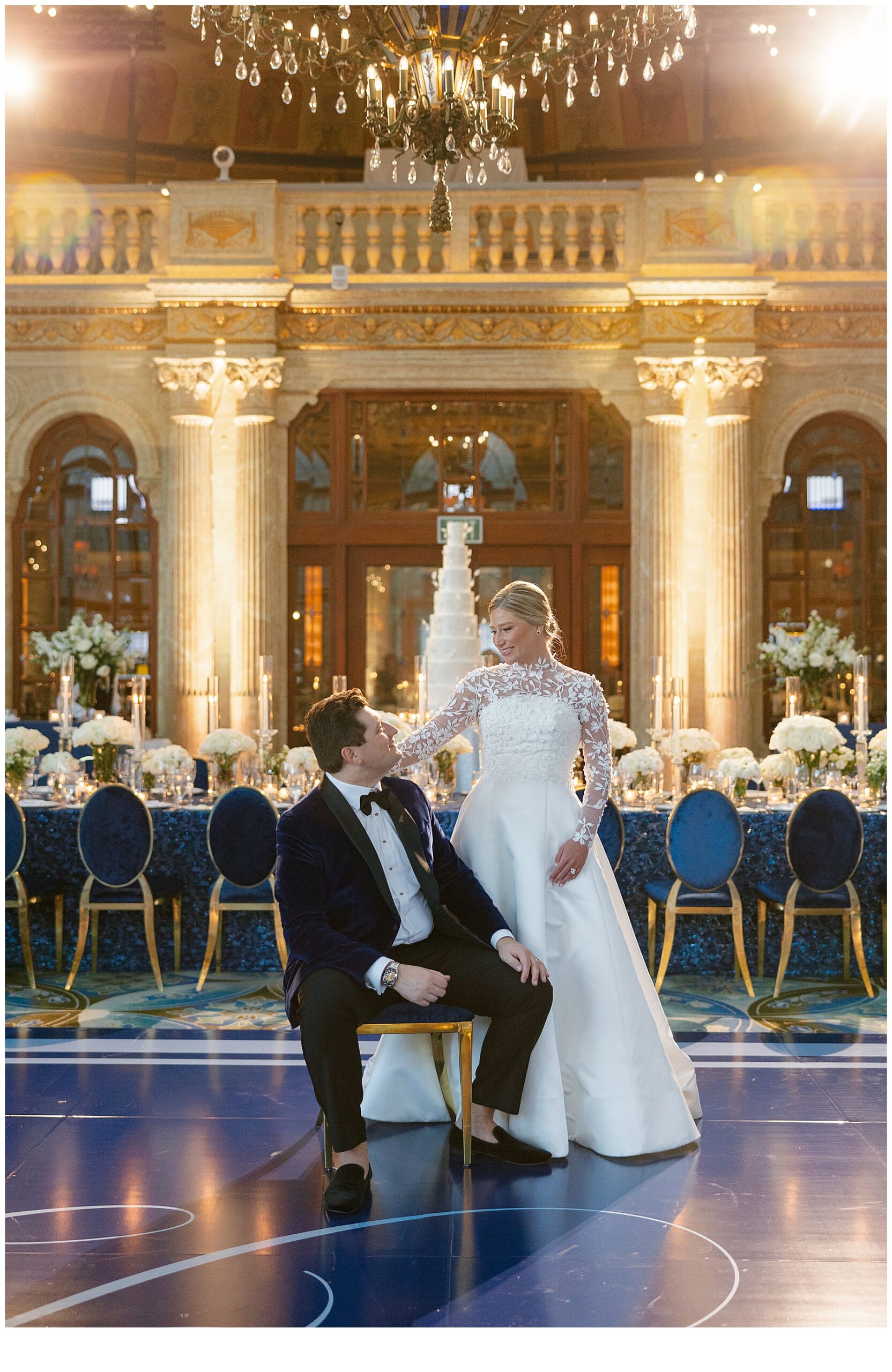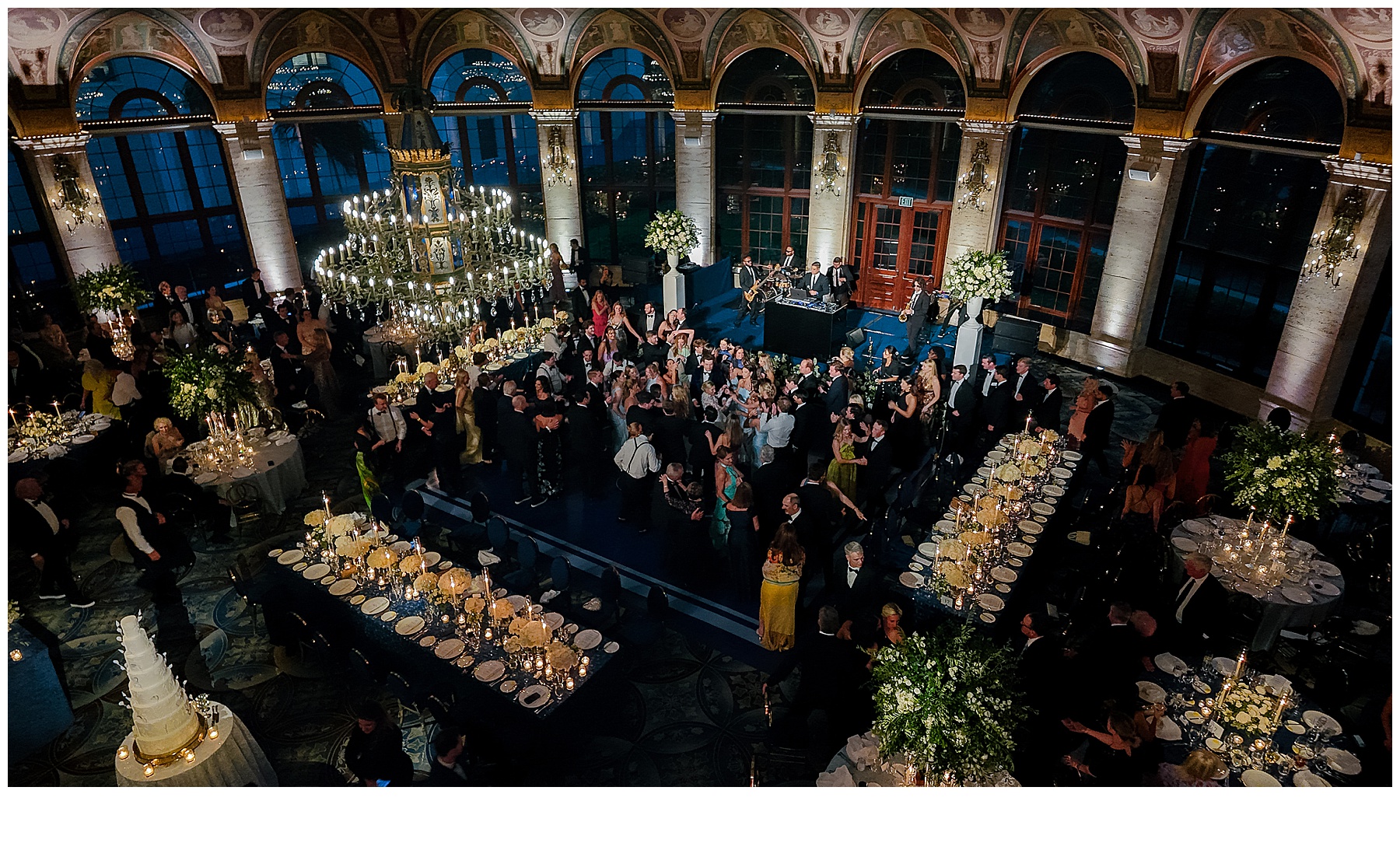 For the reception, The Breakers ballroom was transformed into a refined celebration of luxury. Long tables dressed in rich navy linens, gold accented chairs, and abundant white floral arrangements created a striking contrast against the venue’s historic architecture. A custom blue dance floor with elegant monogramming anchored the room, inviting guests to gather, celebrate, and dance late into the evening.