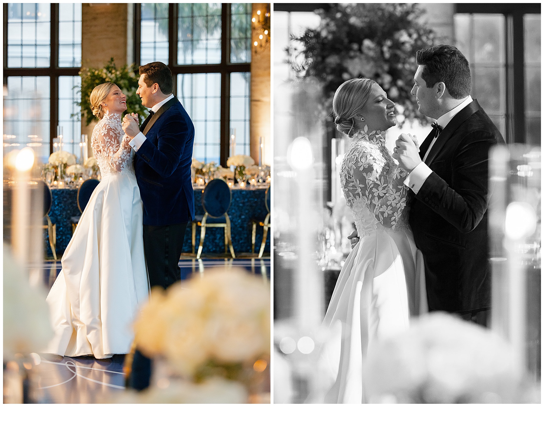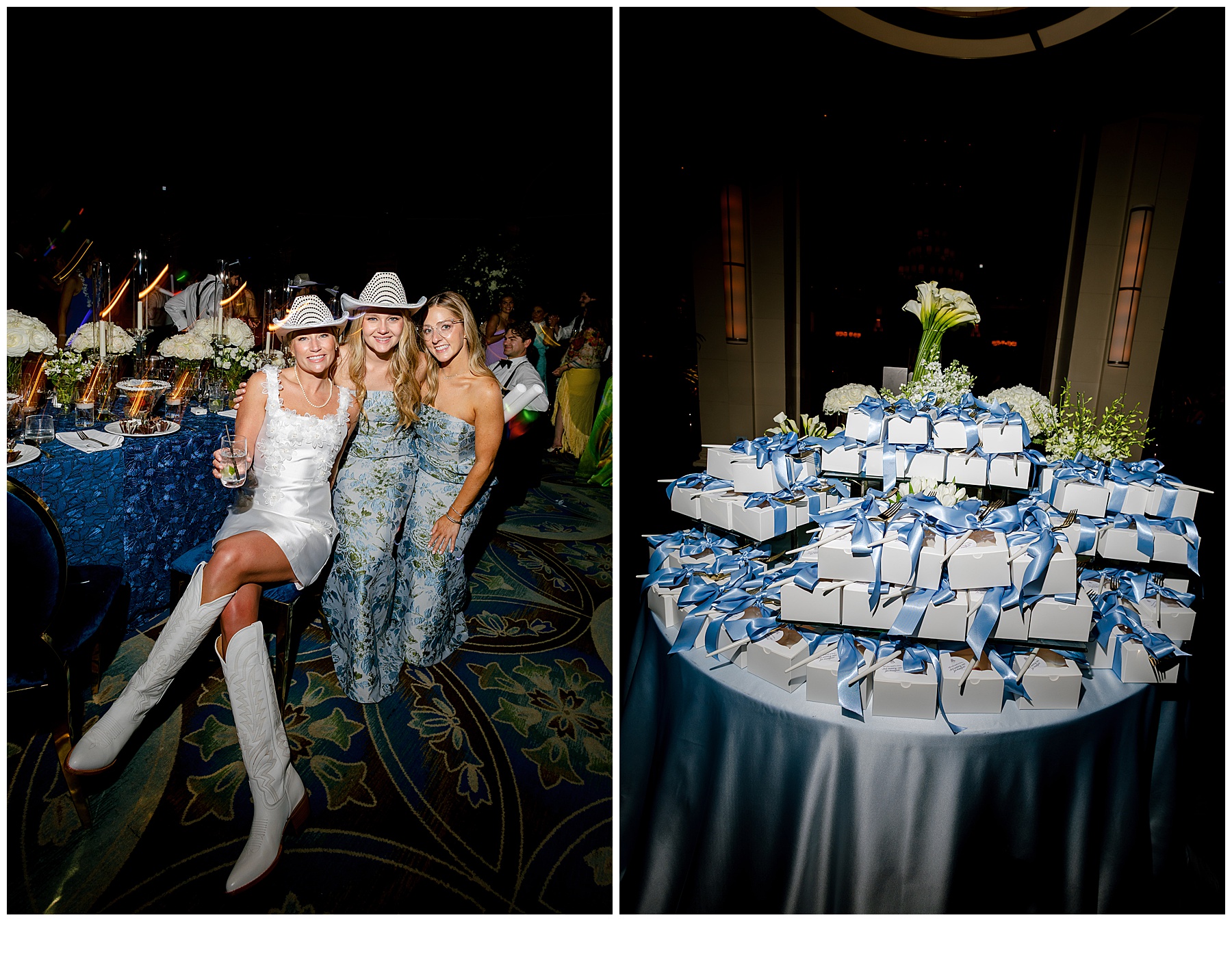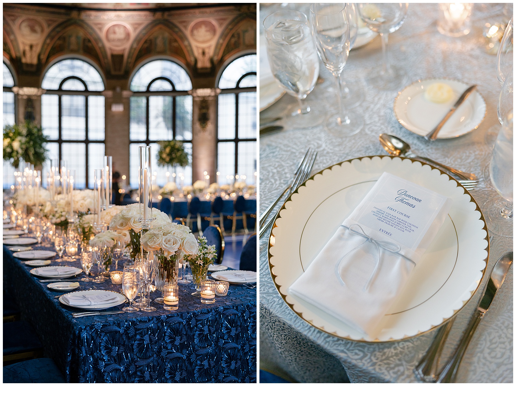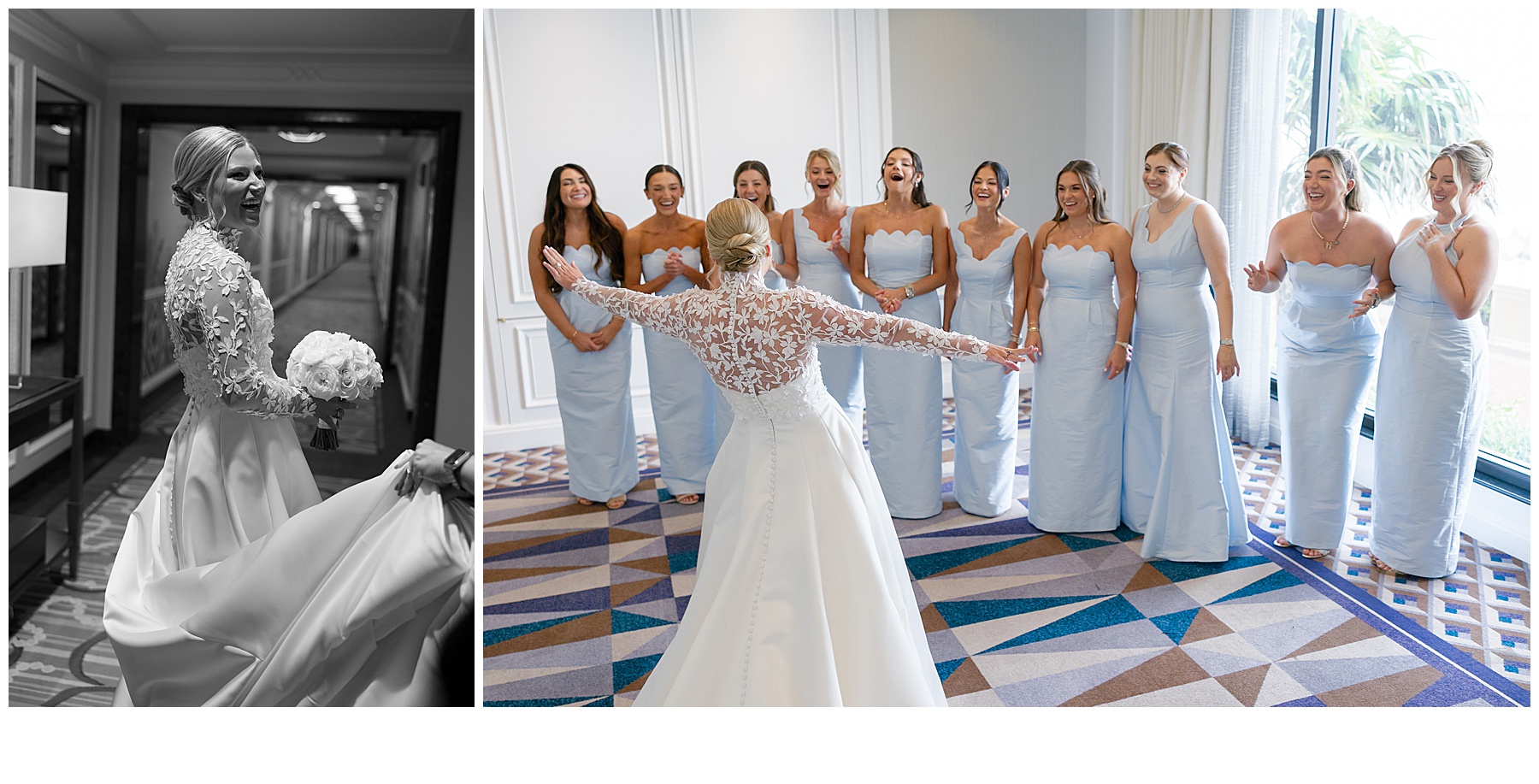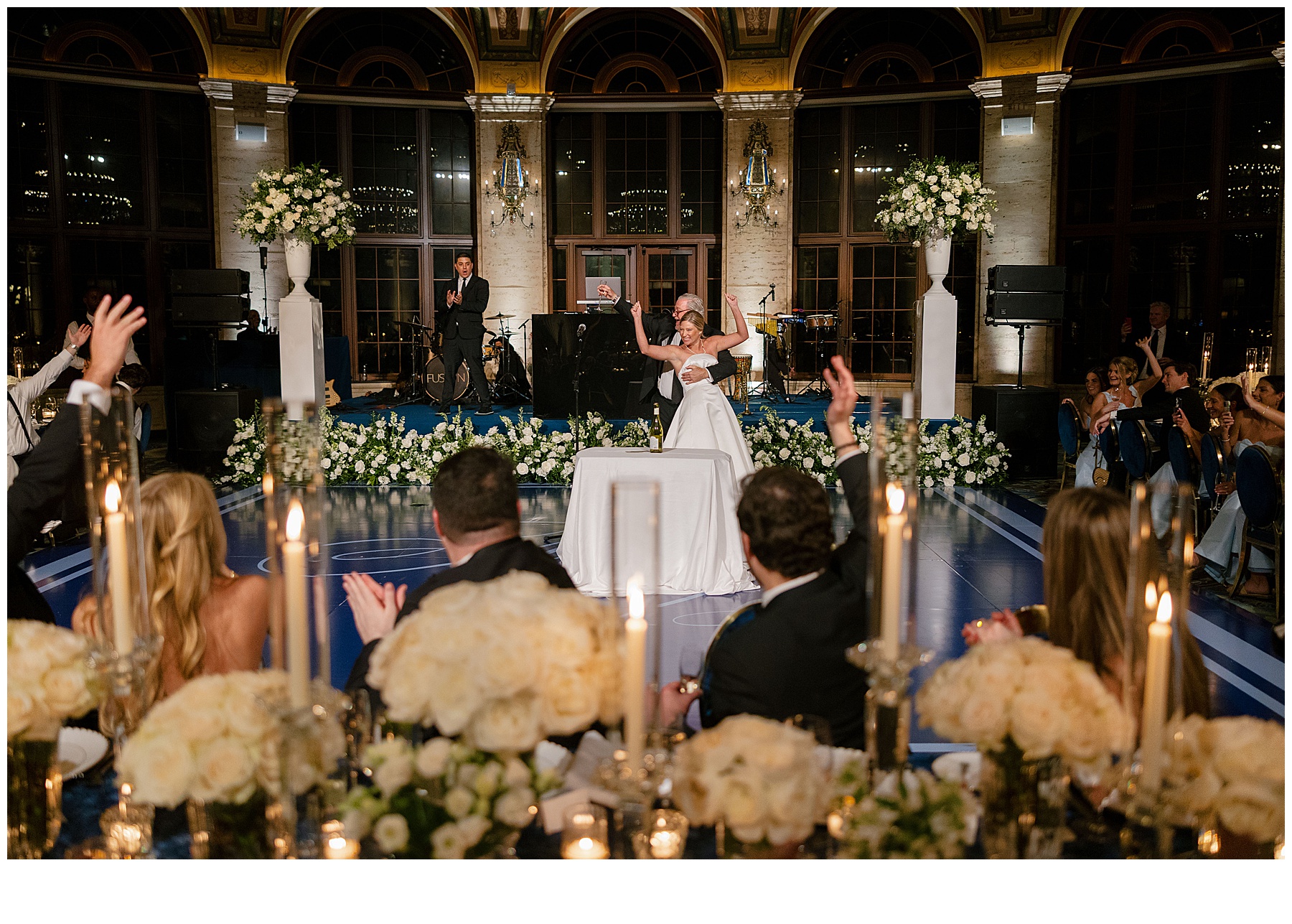 For the reception, The Breakers ballroom was transformed into a refined celebration of luxury. Long tables dressed in rich navy linens, gold accented chairs, and abundant white floral arrangements created a striking contrast against the venue’s historic architecture. A custom blue dance floor with elegant monogramming anchored the room, inviting guests to gather, celebrate, and dance late into the evening.