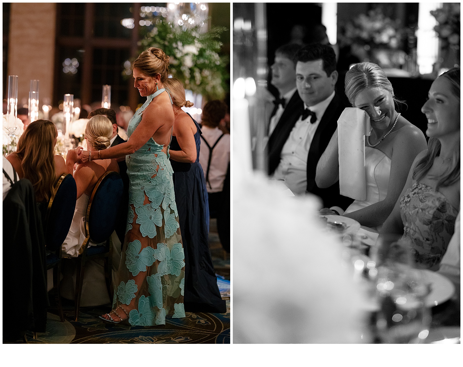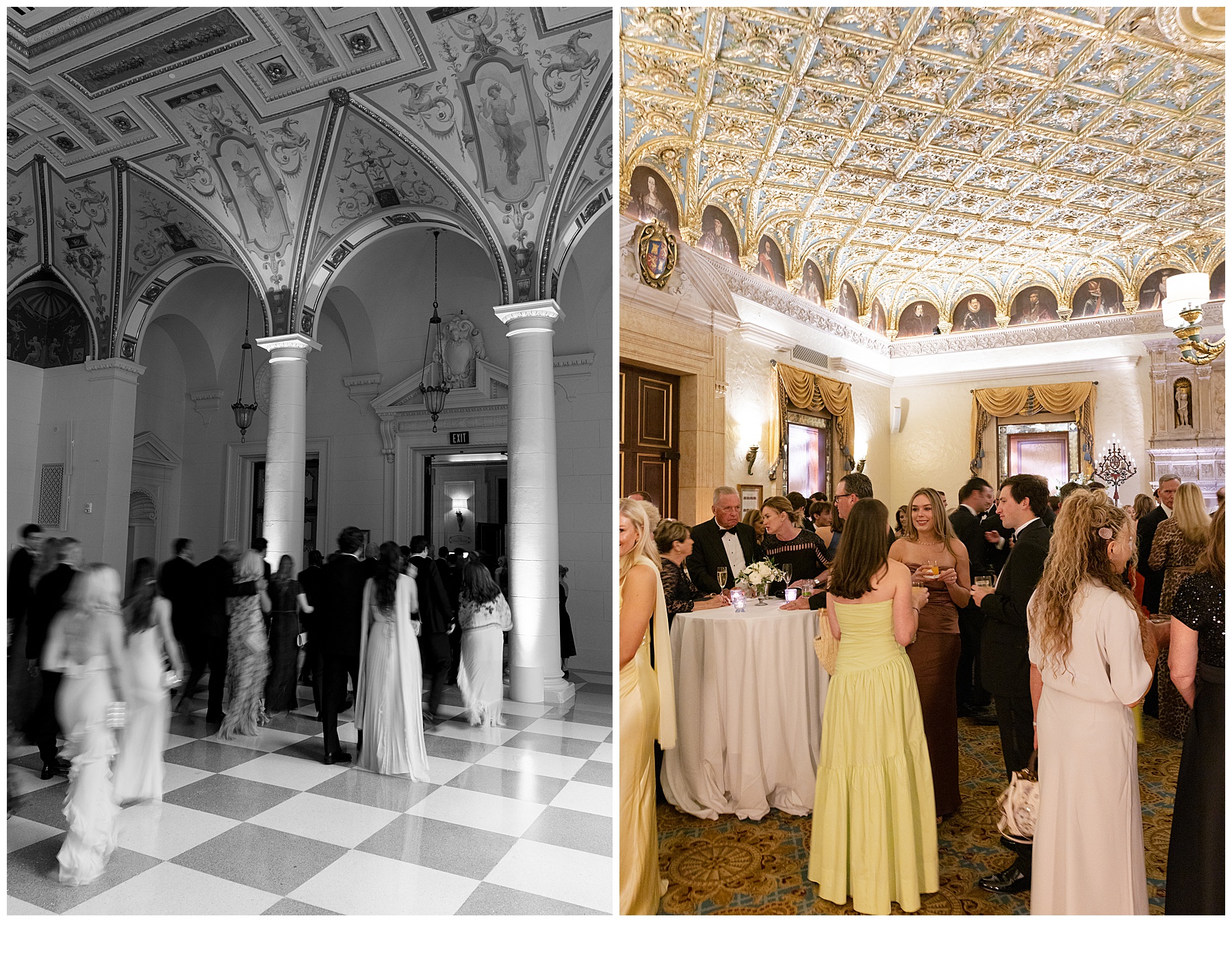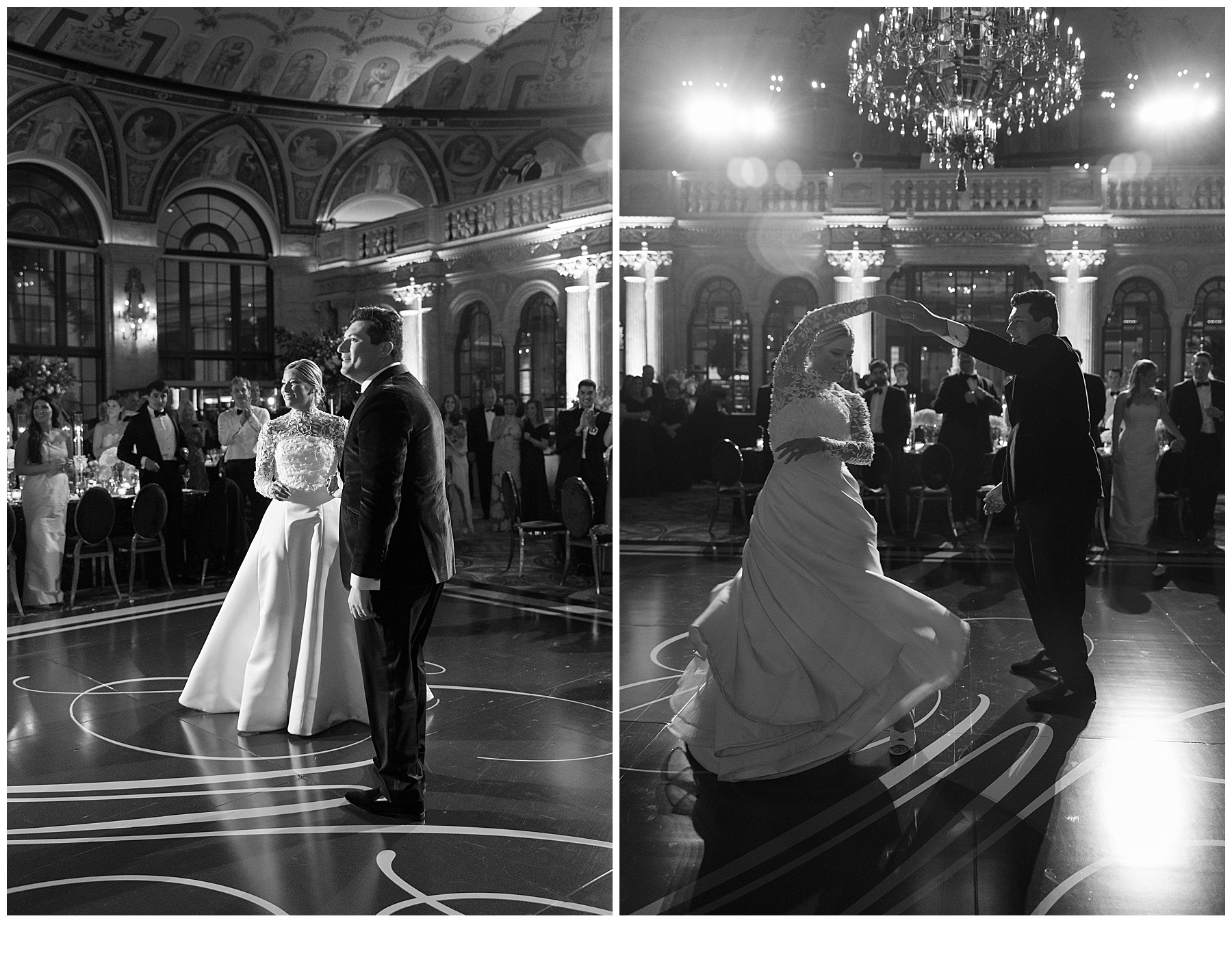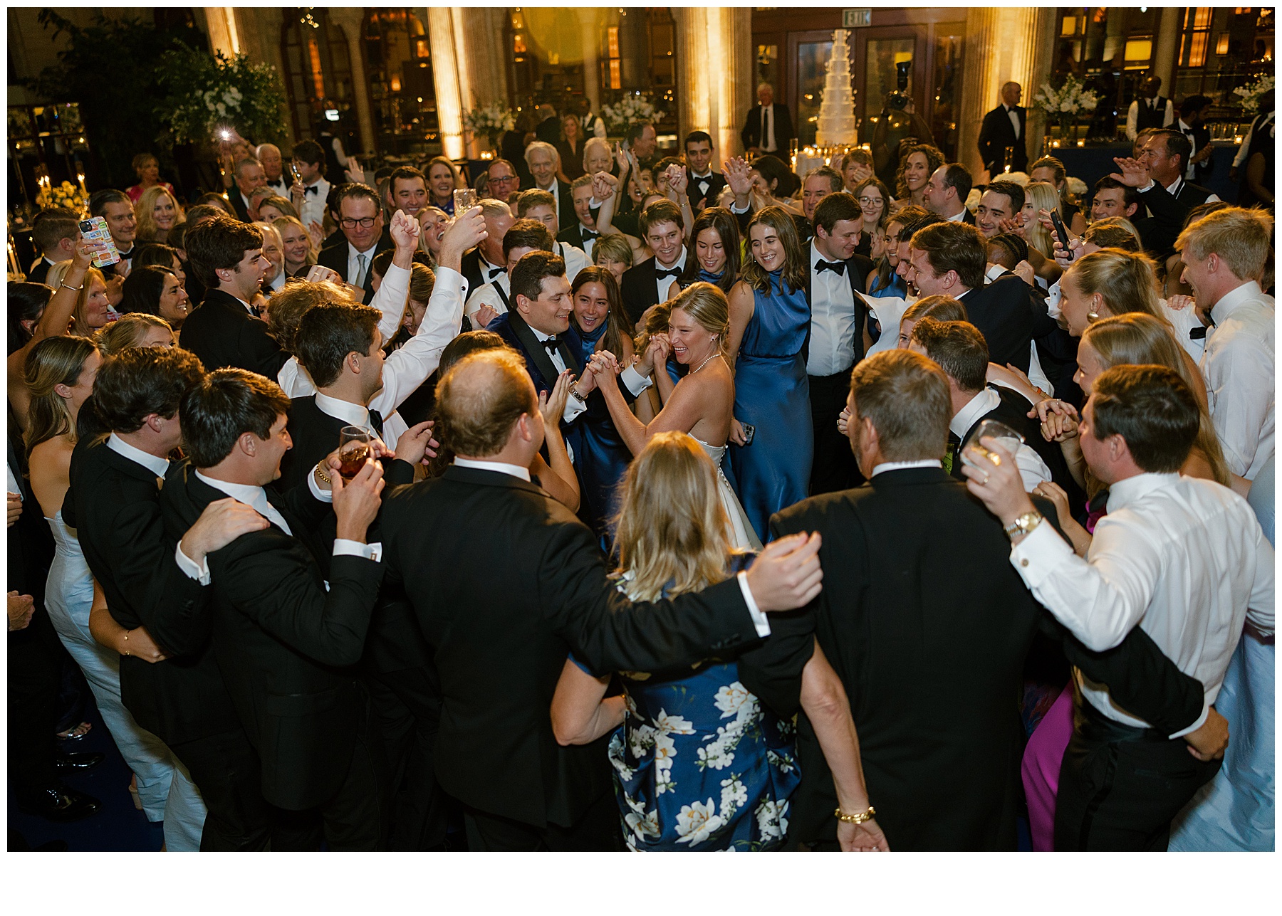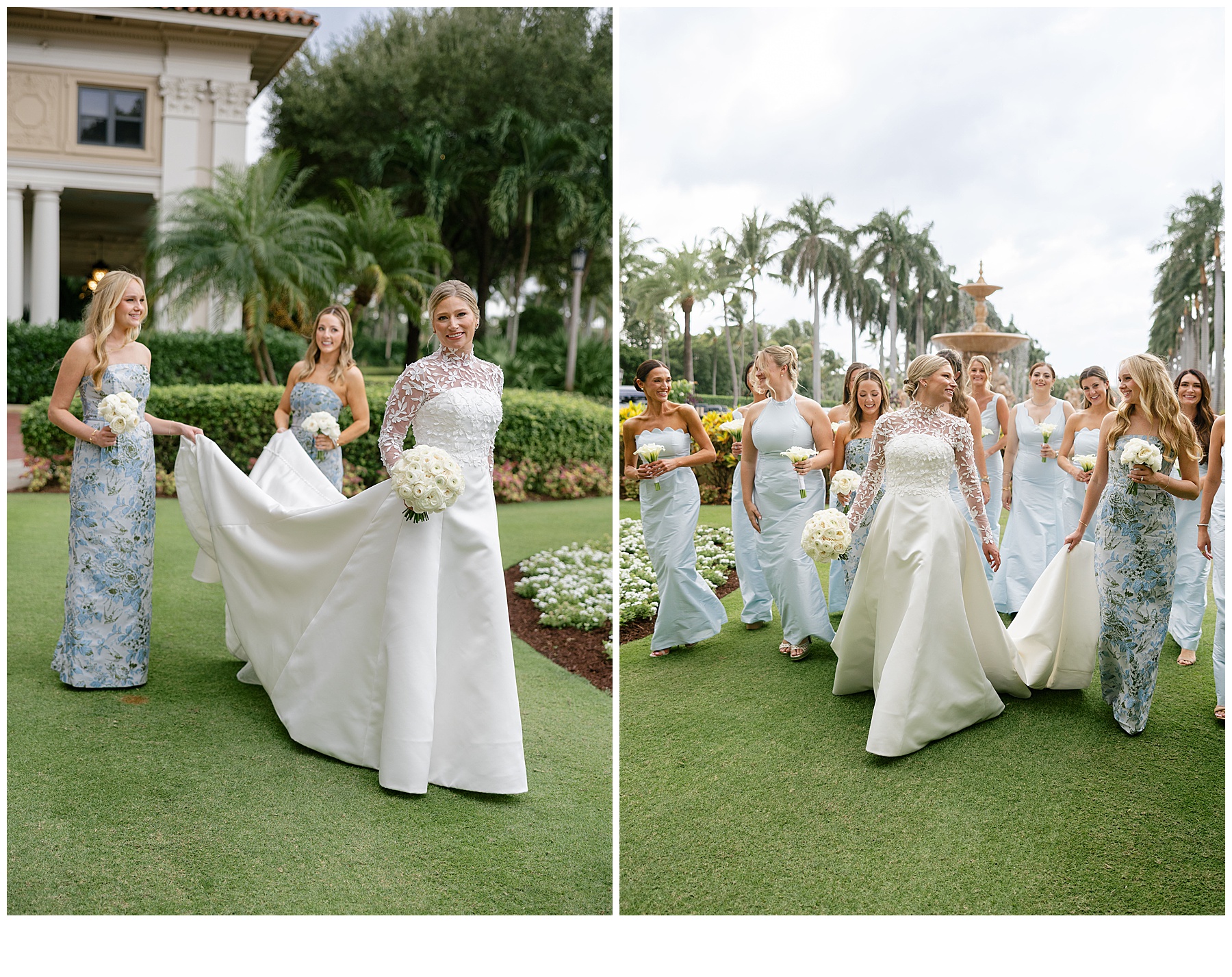 For the reception, The Breakers ballroom was transformed into a refined celebration of luxury. Long tables dressed in rich navy linens, gold accented chairs, and abundant white floral arrangements created a striking contrast against the venue’s historic architecture. A custom blue dance floor with elegant monogramming anchored the room, inviting guests to gather, celebrate, and dance late into the evening.