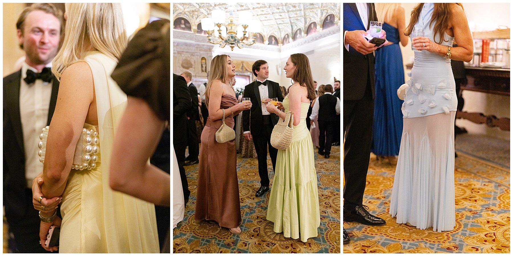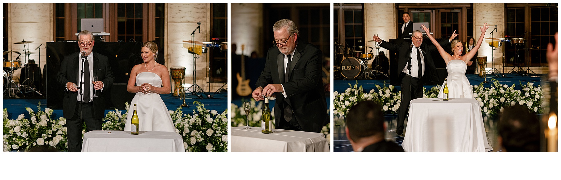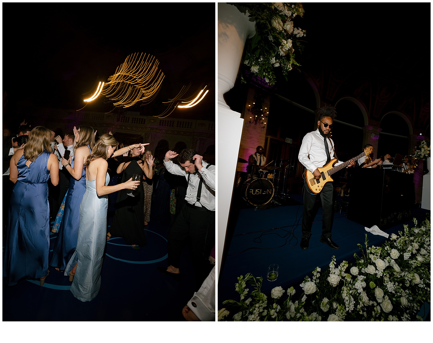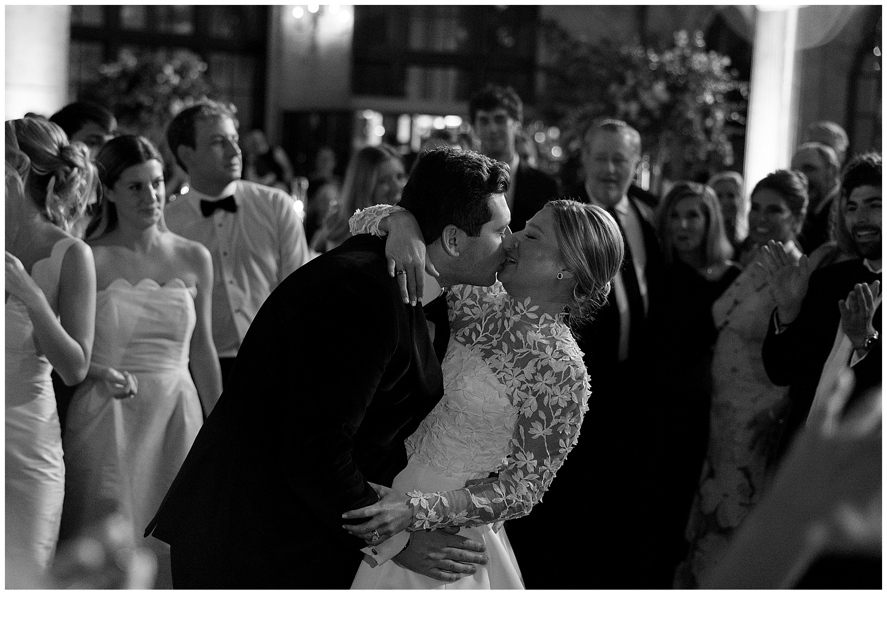 For the reception, The Breakers ballroom was transformed into a refined celebration of luxury. Long tables dressed in rich navy linens, gold accented chairs, and abundant white floral arrangements created a striking contrast against the venue’s historic architecture. A custom blue dance floor with elegant monogramming anchored the room, inviting guests to gather, celebrate, and dance late into the evening.