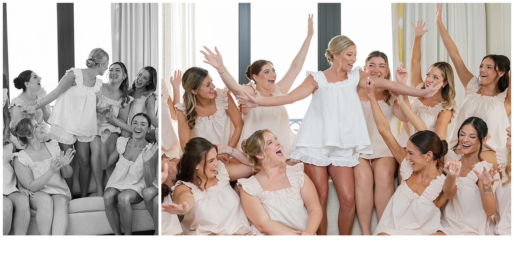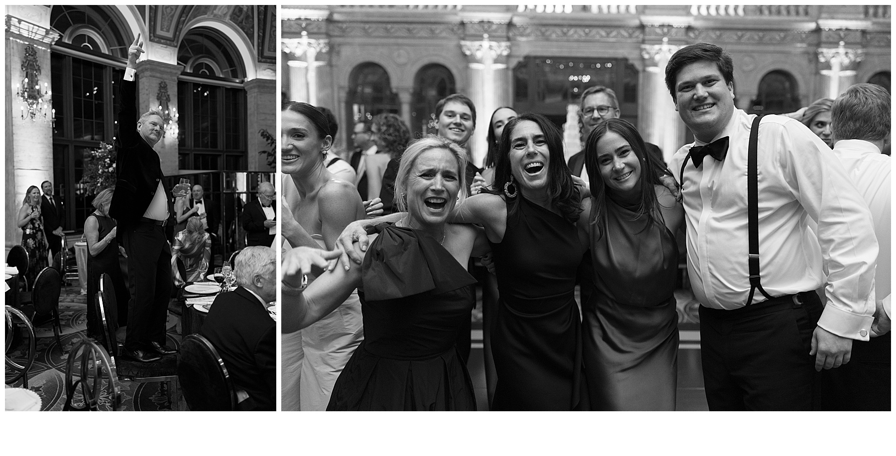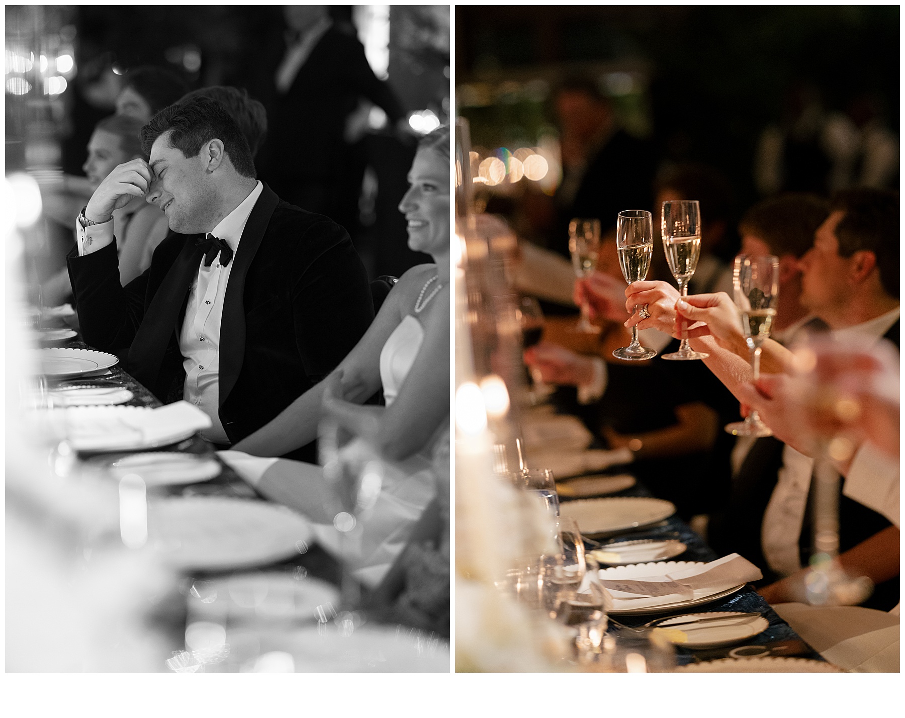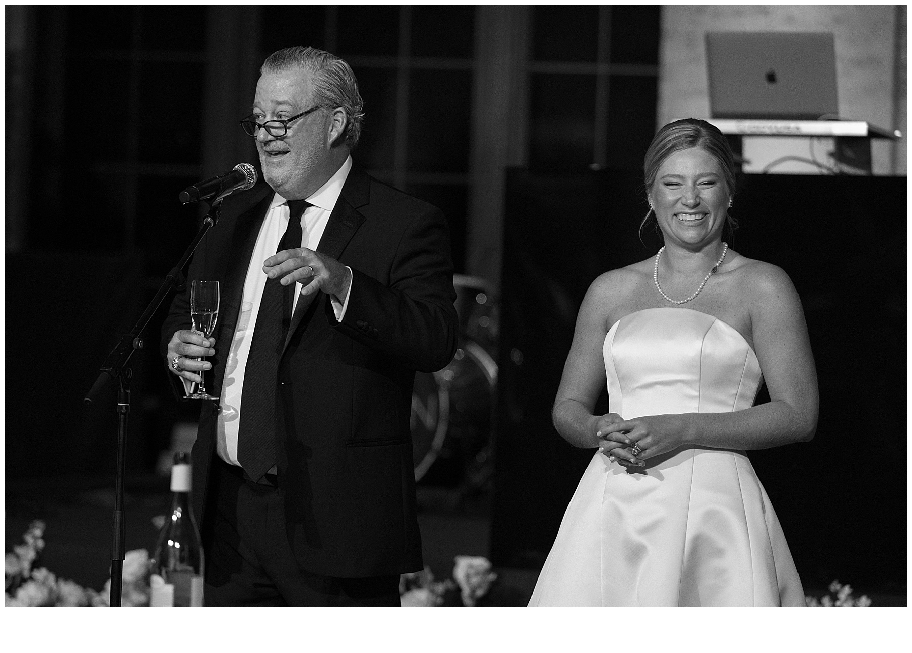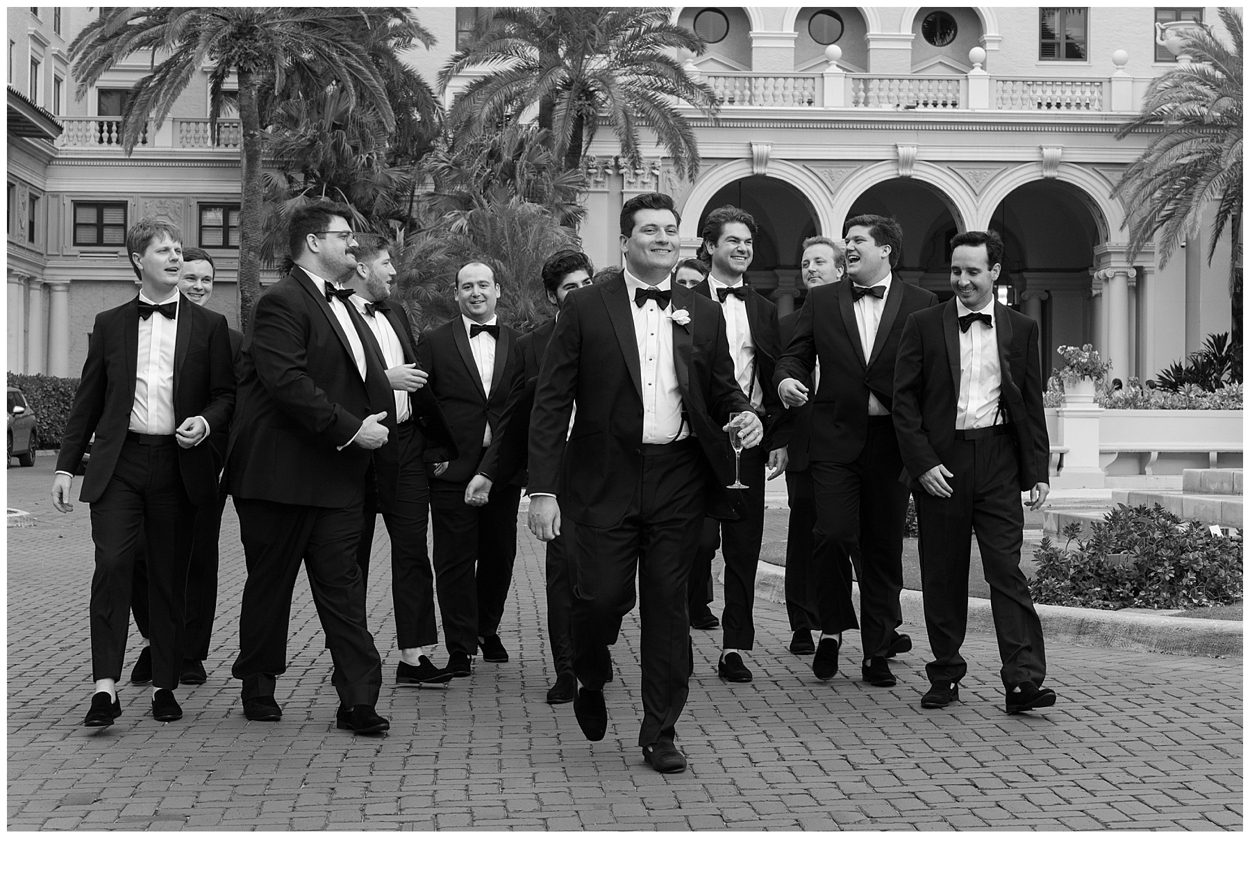 For the reception, The Breakers ballroom was transformed into a refined celebration of luxury. Long tables dressed in rich navy linens, gold accented chairs, and abundant white floral arrangements created a striking contrast against the venue’s historic architecture. A custom blue dance floor with elegant monogramming anchored the room, inviting guests to gather, celebrate, and dance late into the evening.
