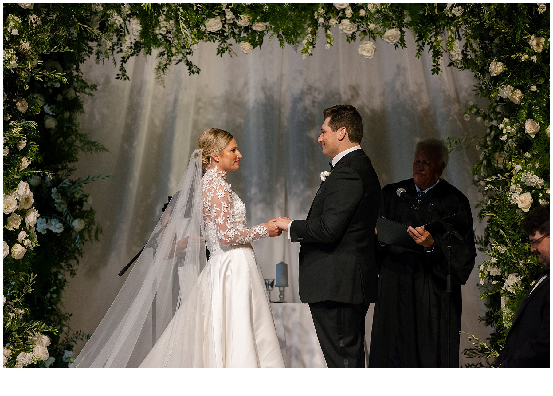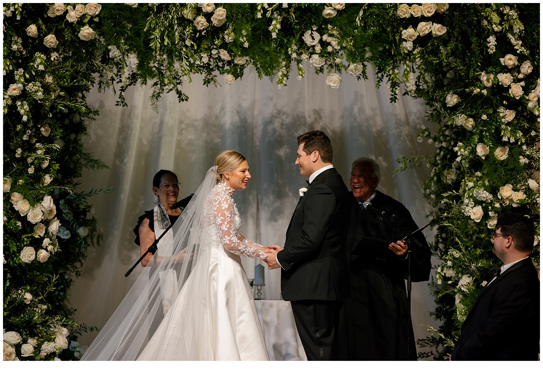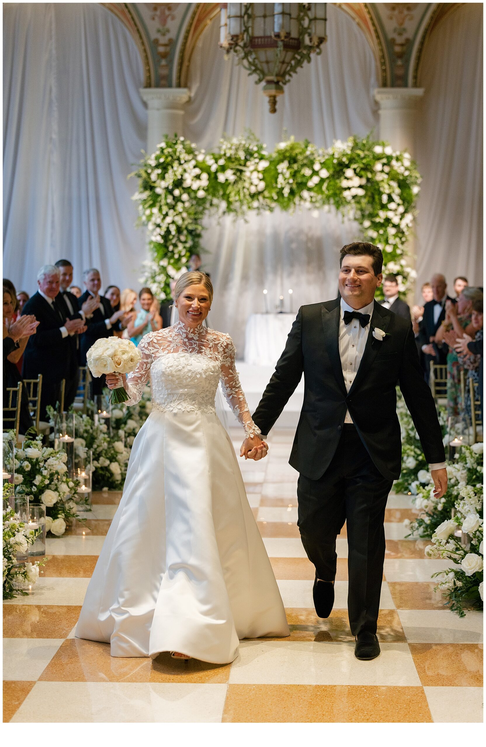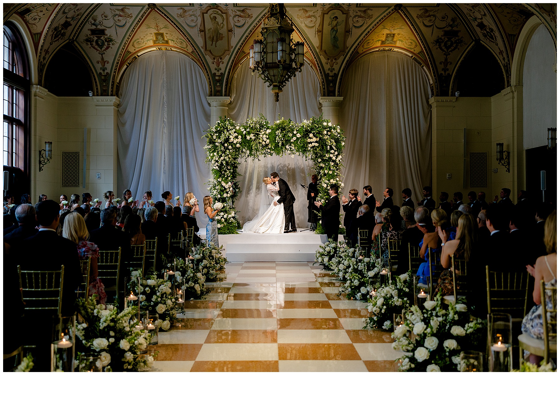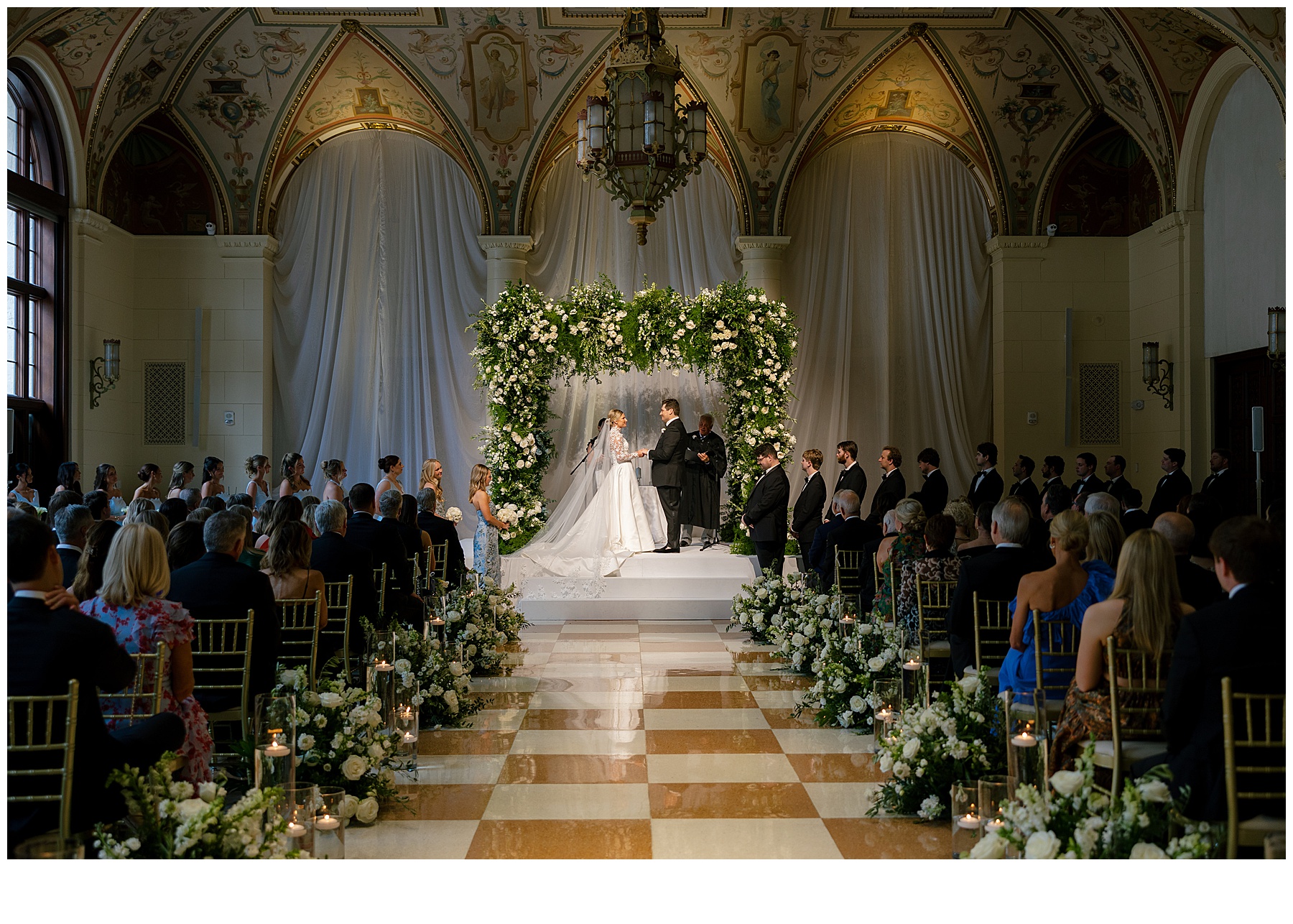 The ceremony unfolded beneath soaring ceilings and ornate architecture, where soft draping and a lush floral arch framed the couple as they exchanged vows. White florals and greenery lined the aisle, paired with glowing candlelight that added warmth and intimacy to the grandeur of the space. As the couple walked back hand in hand, the room filled with applause, emotion, and an undeniable sense of joy.