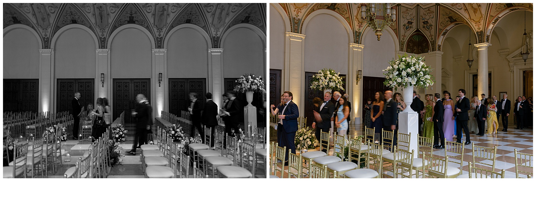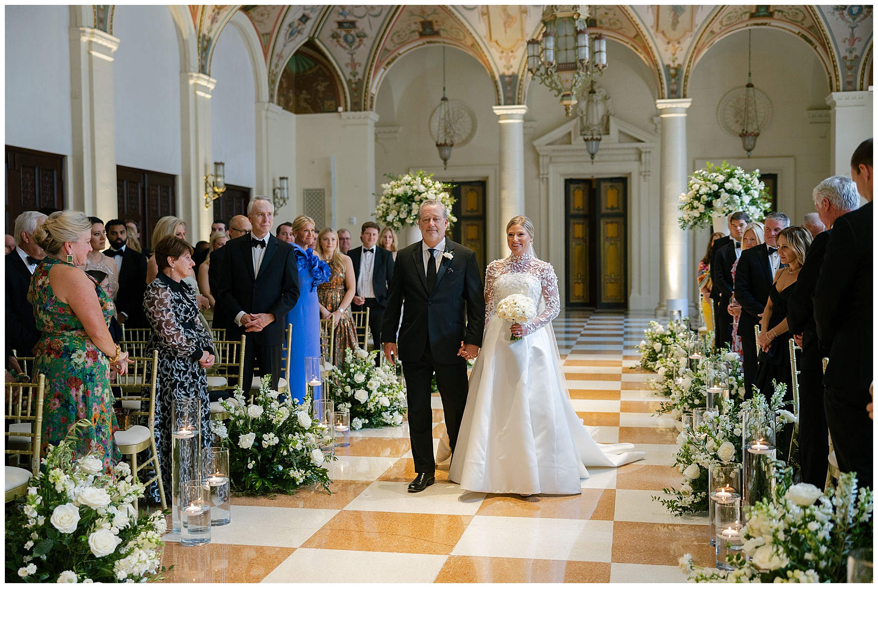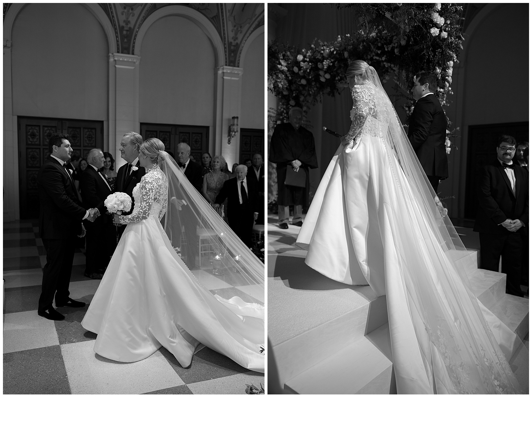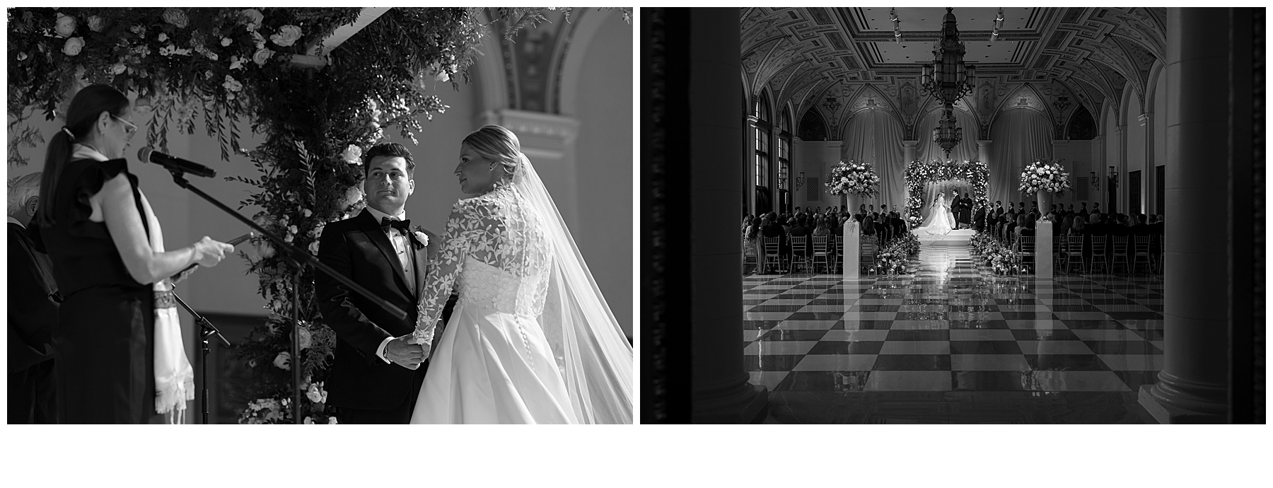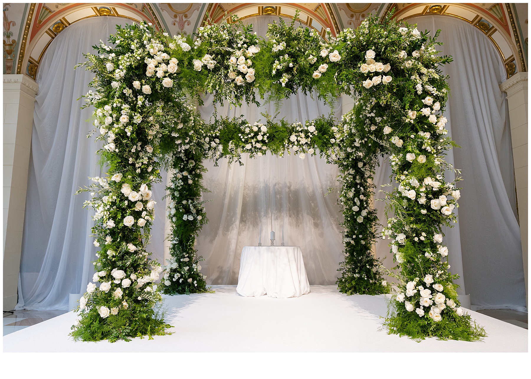 The ceremony unfolded beneath soaring ceilings and ornate architecture, where soft draping and a lush floral arch framed the couple as they exchanged vows. White florals and greenery lined the aisle, paired with glowing candlelight that added warmth and intimacy to the grandeur of the space. As the couple walked back hand in hand, the room filled with applause, emotion, and an undeniable sense of joy.