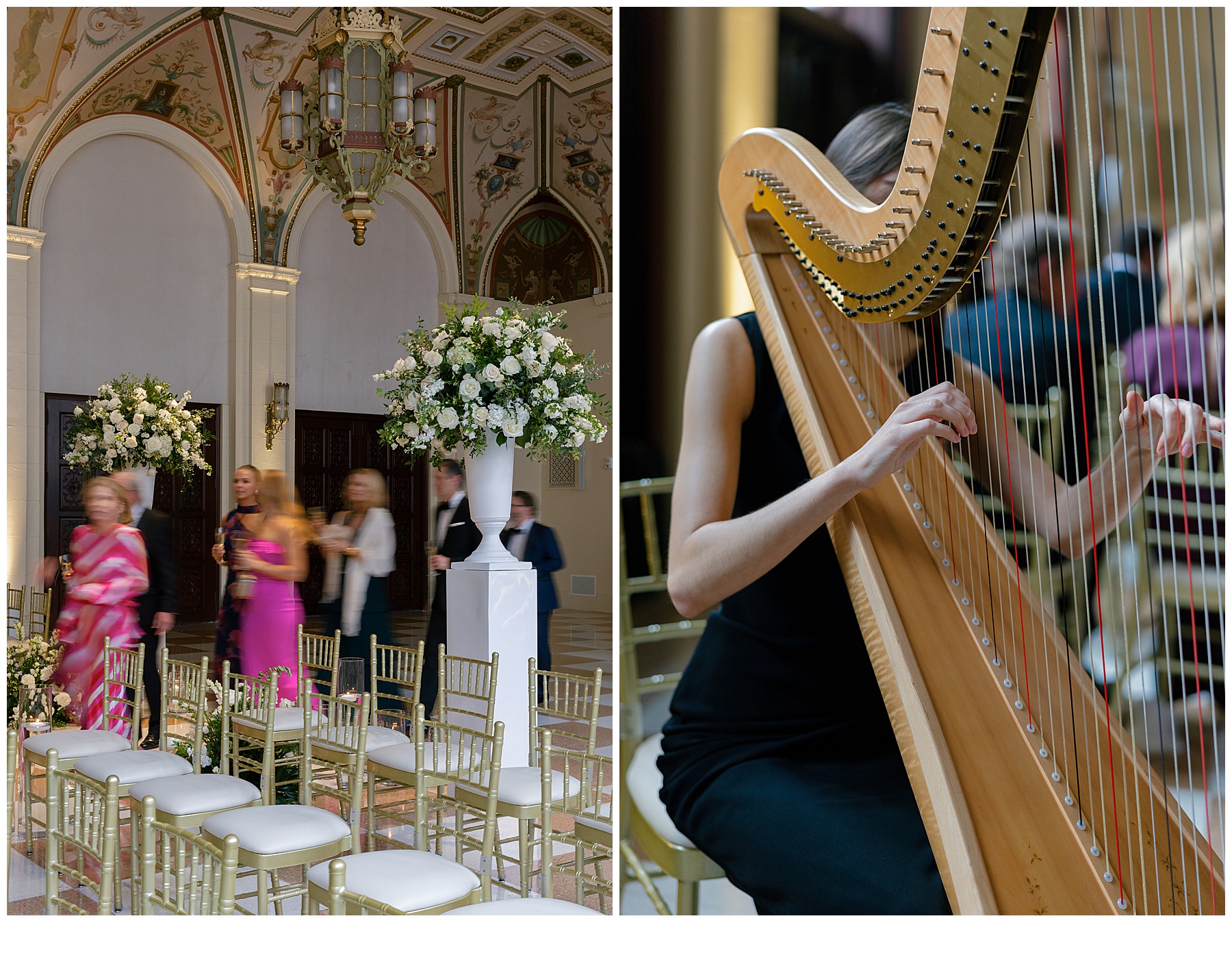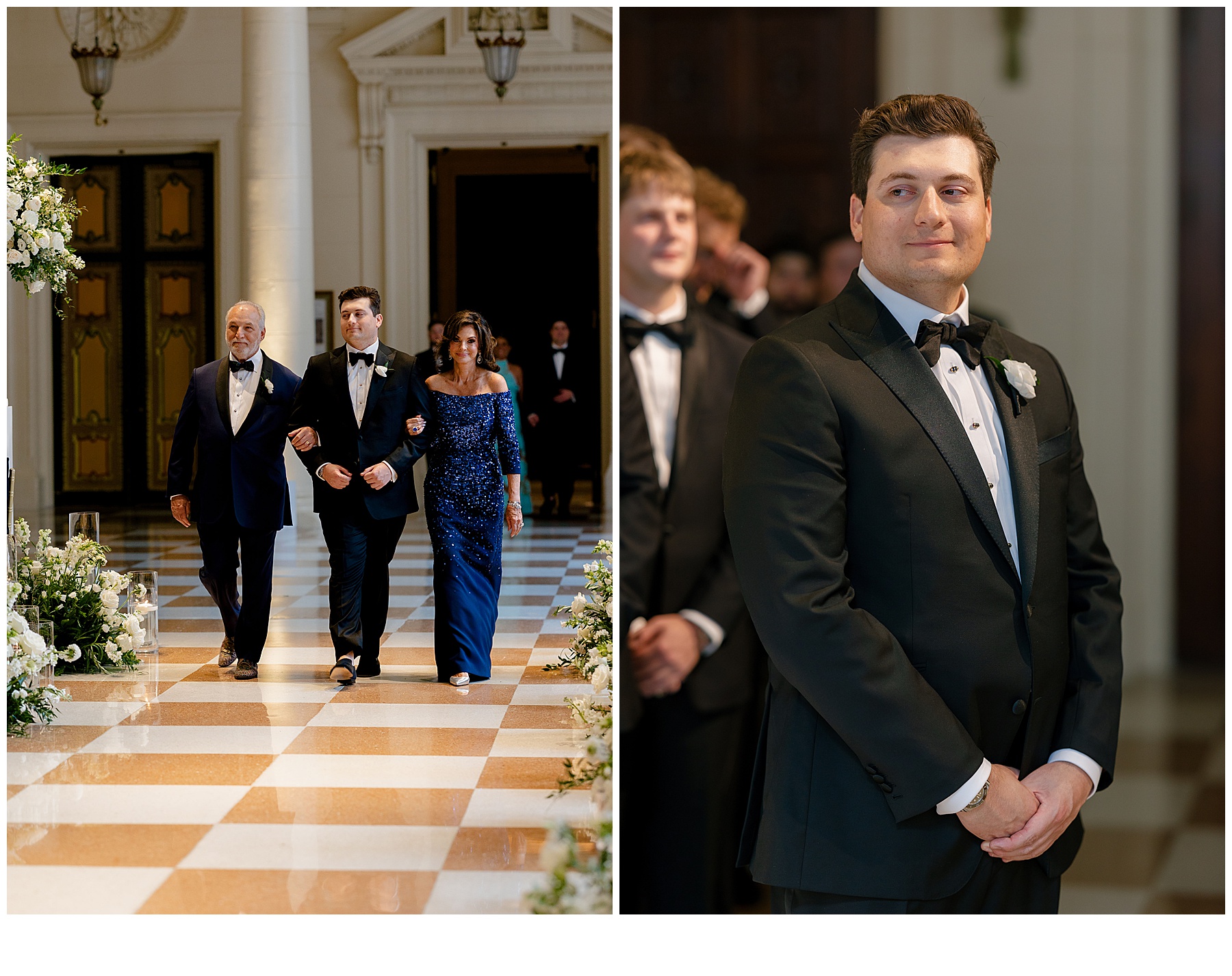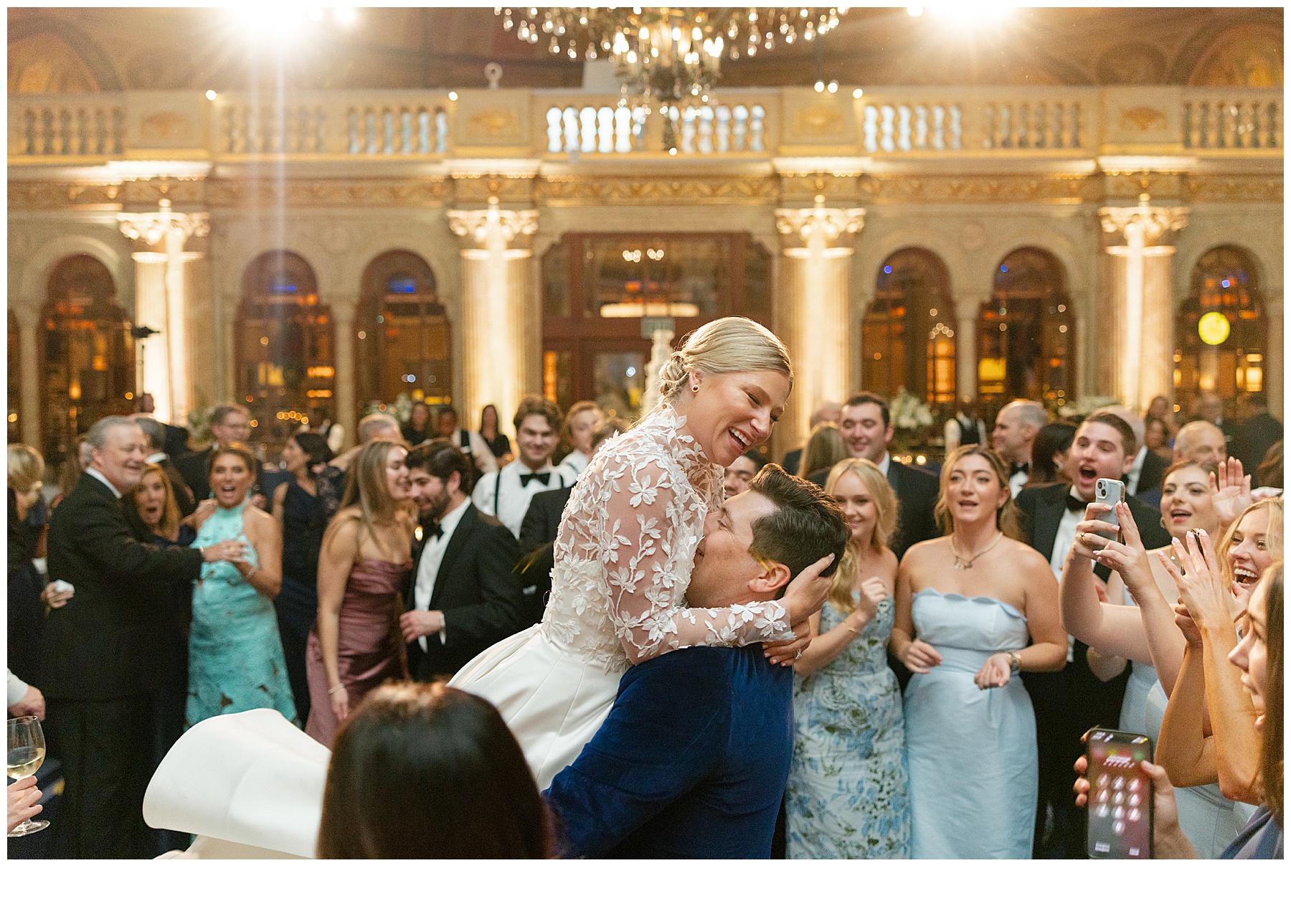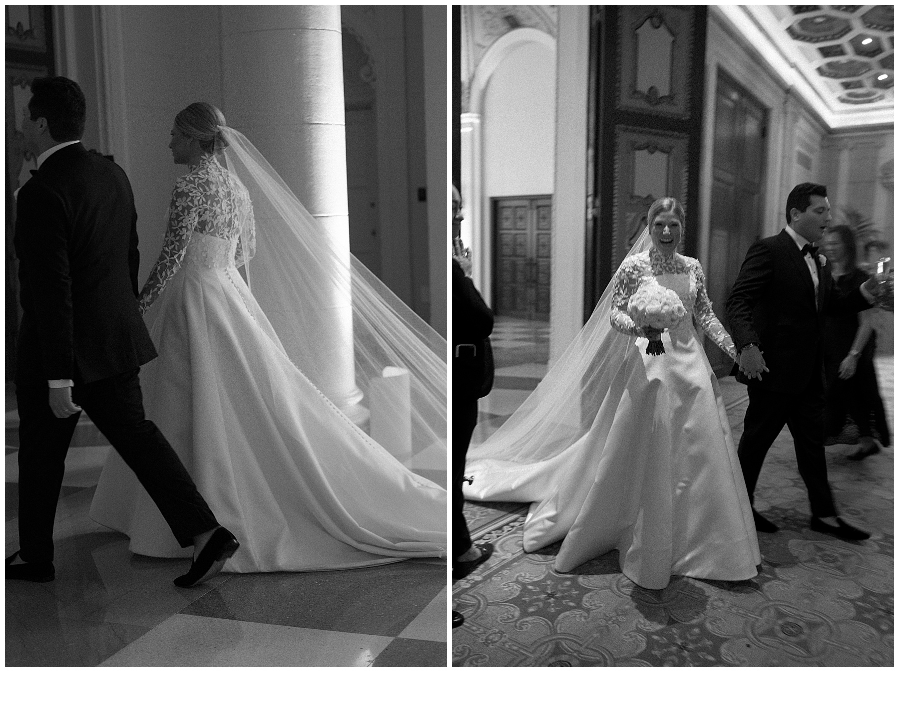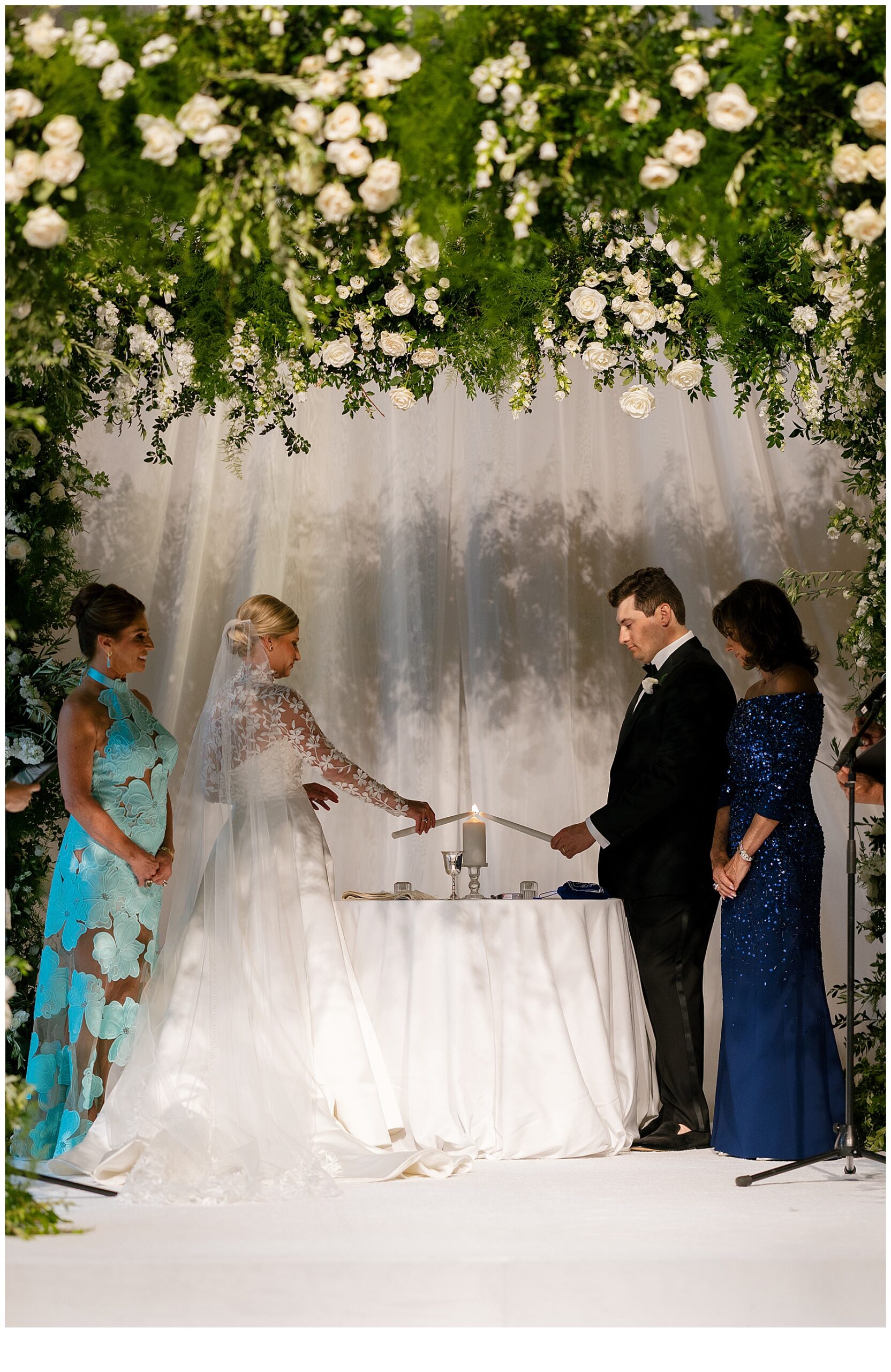 The ceremony unfolded beneath soaring ceilings and ornate architecture, where soft draping and a lush floral arch framed the couple as they exchanged vows. White florals and greenery lined the aisle, paired with glowing candlelight that added warmth and intimacy to the grandeur of the space. As the couple walked back hand in hand, the room filled with applause, emotion, and an undeniable sense of joy.