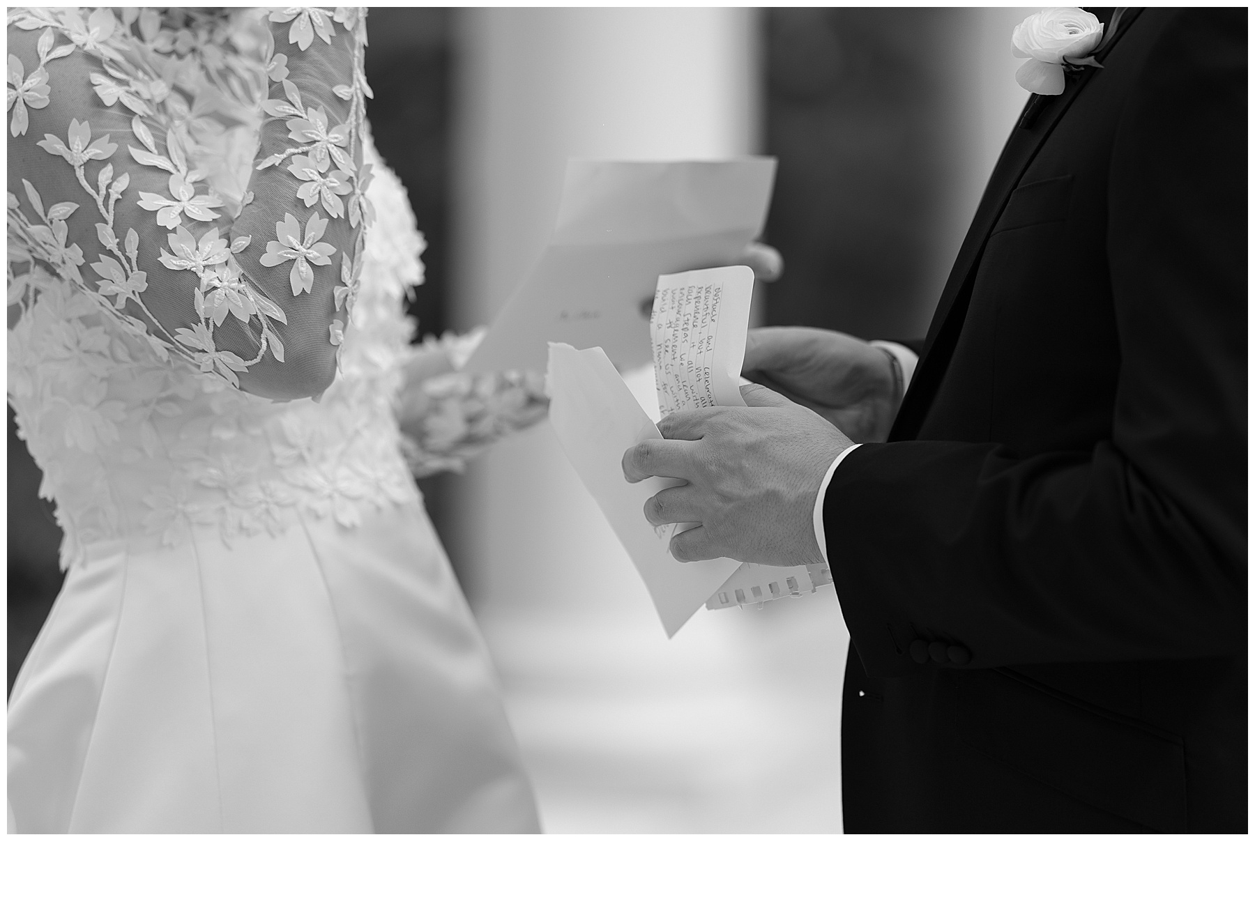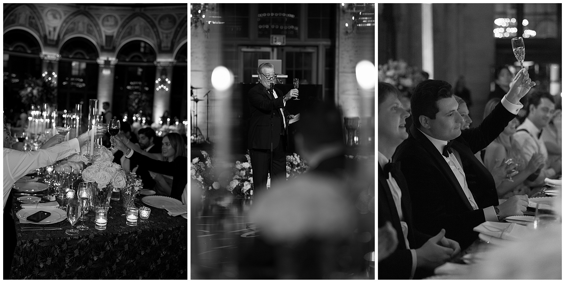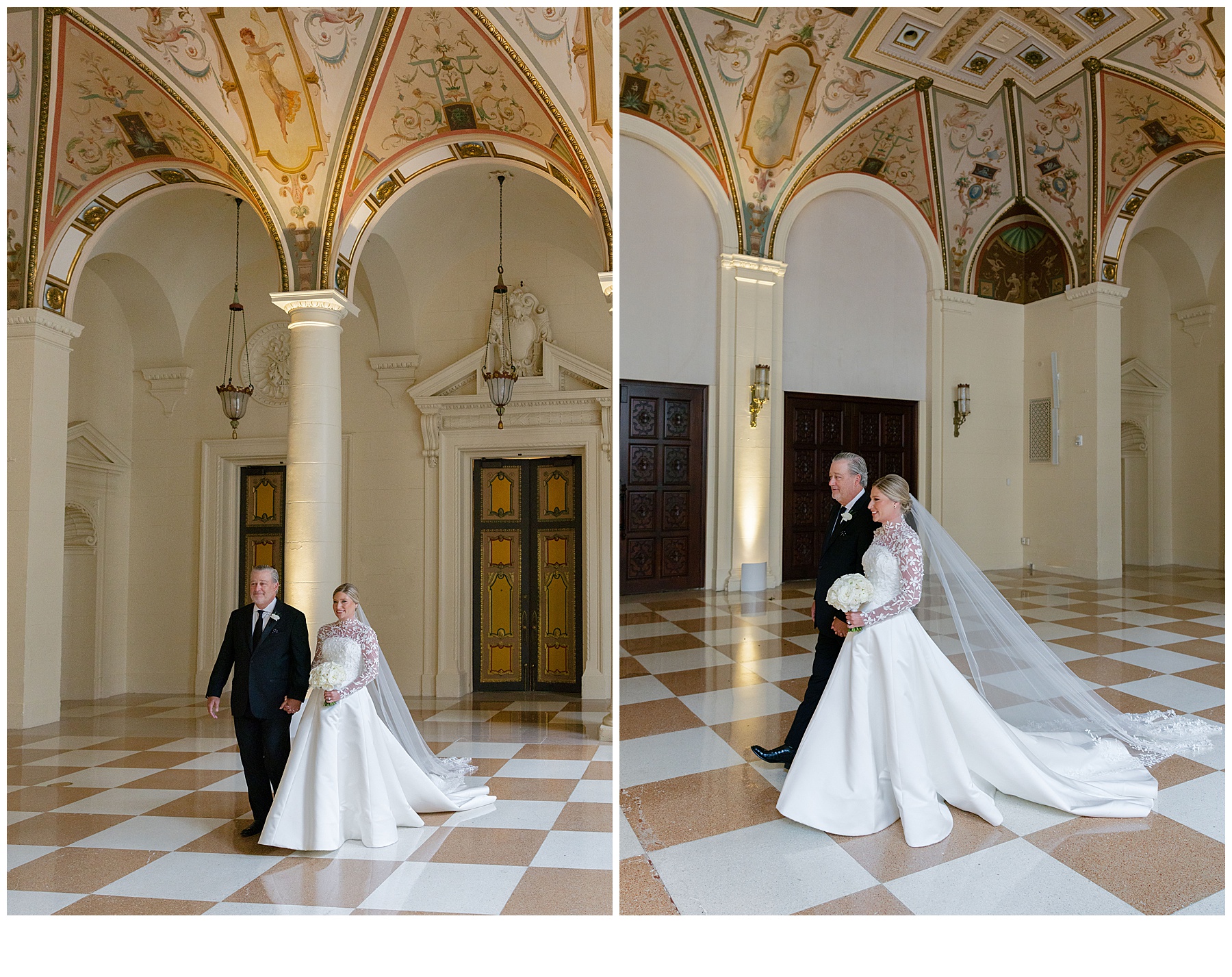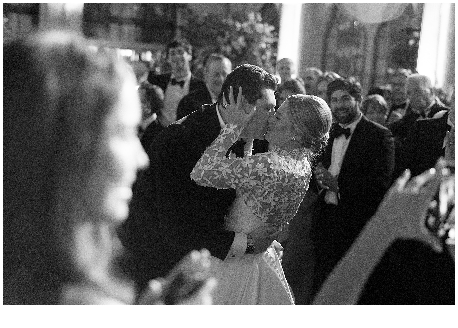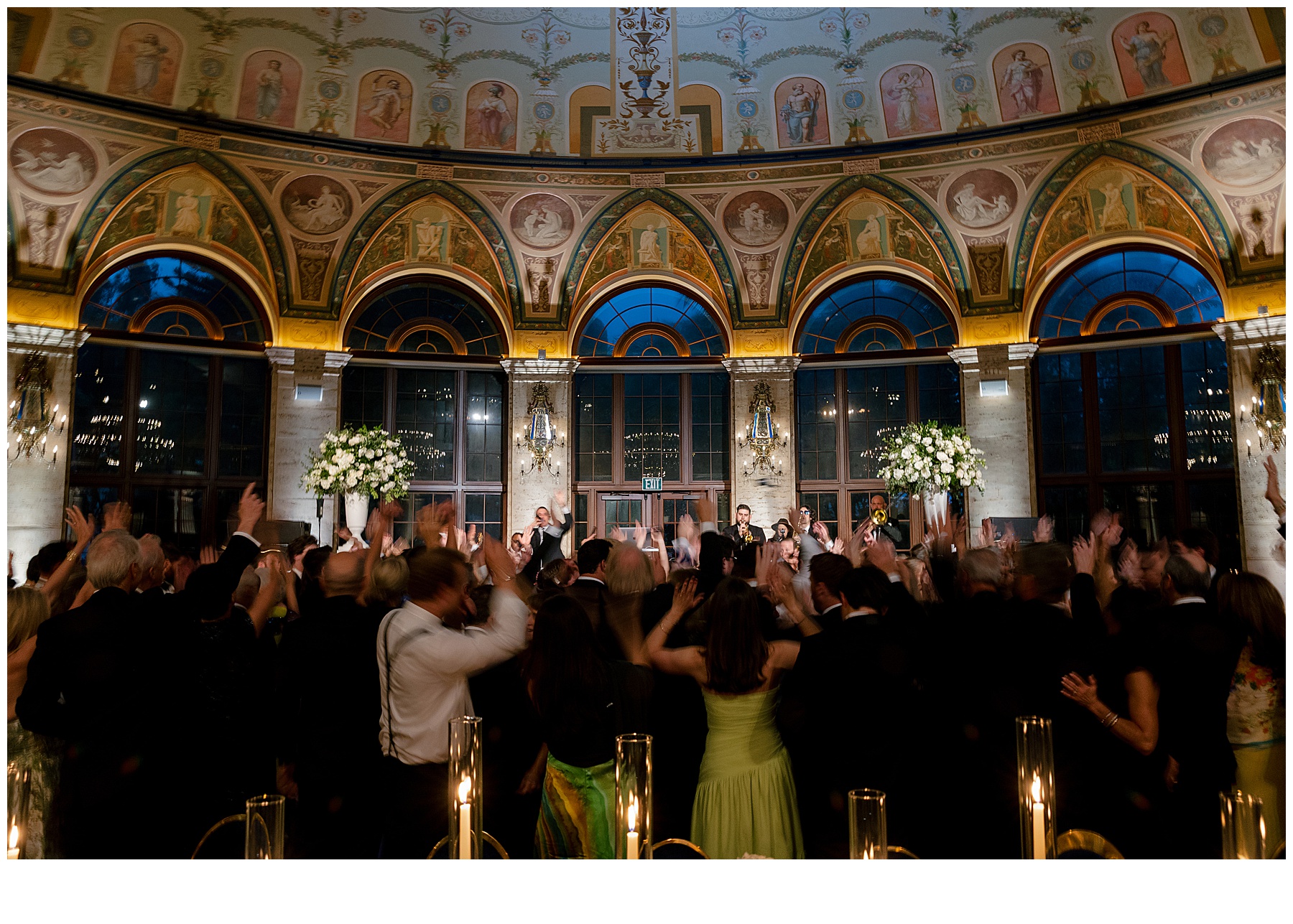 The ceremony unfolded beneath soaring ceilings and ornate architecture, where soft draping and a lush floral arch framed the couple as they exchanged vows. White florals and greenery lined the aisle, paired with glowing candlelight that added warmth and intimacy to the grandeur of the space. As the couple walked back hand in hand, the room filled with applause, emotion, and an undeniable sense of joy.